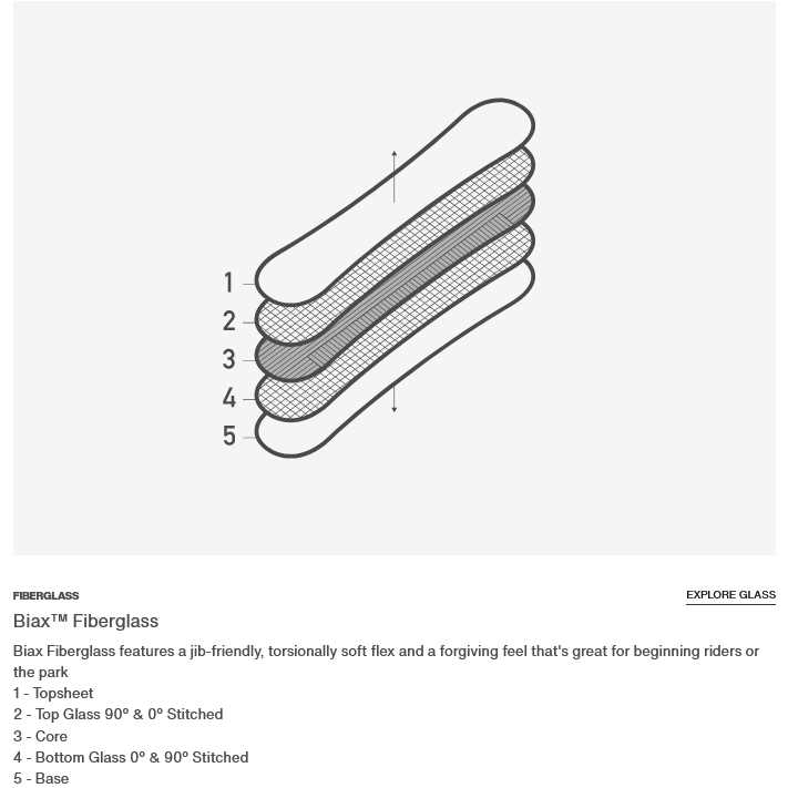 • Biax Fiberglass features a jib-friendly, torsionally soft flex and a forgiving feel that’s great for beginning riders or the park