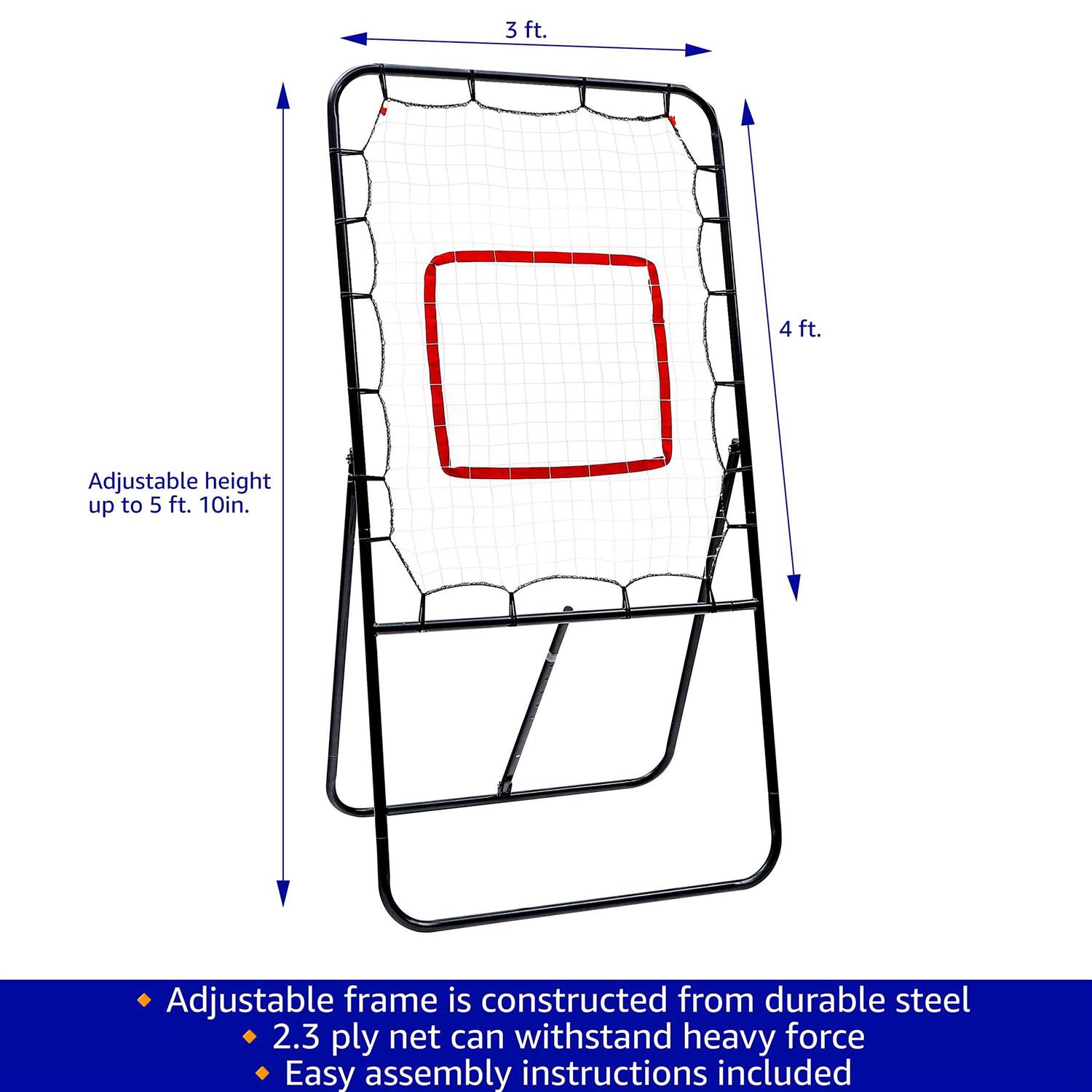 The rebounder measures 4’L x 3’W x 3’H and comes with 4 stakes to secure in the ground The net is durable 2.3-ply PE and the frame is sturdy steel construction Includes easy to set up instructions Practice shooting, passing and accuracy By Trademark Innovations