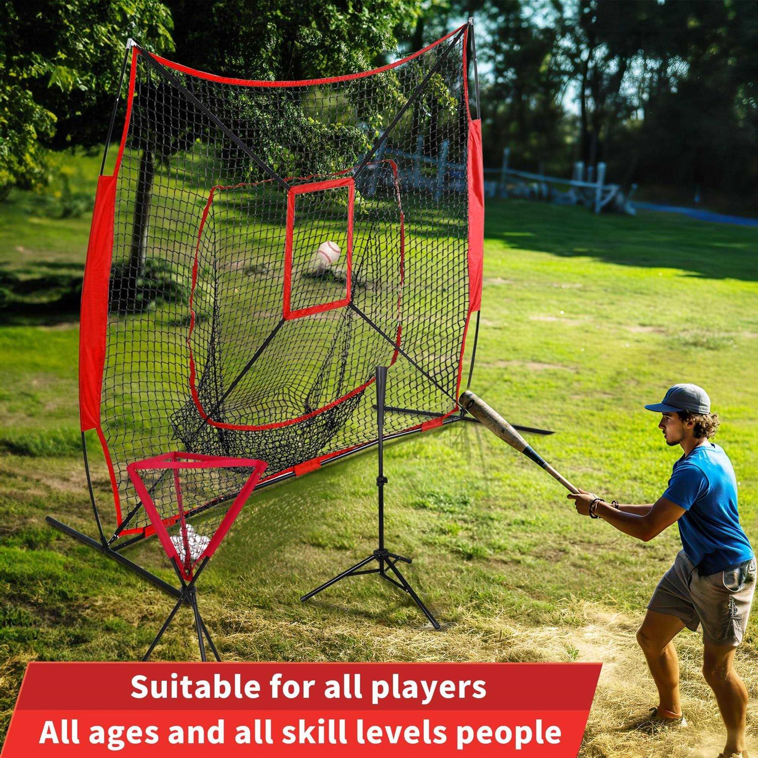 【Sturdy Construction】This 7′ x 7′ baseball net is made from a powder-coated steel frame, with a sturdy frame and tear-resistant polyester mesh for greater stability when hitting and pitching for years to come. Rubber feet on each leg for added stability. 【Easy Pop-up and Set】The product comes with all accessories and easy to install. Quick loop hooks make it easy to assemble and disassemble without tools. 4 ground stakes for added stability. 【Versatile Goal】The best baseball and softball practice nets for outdoor practice in hitting, defending, pitching, throwing and serving. Whether you are a professional or a hobbyist, you can find fun. 【Strike Zone Target】Allows you to better focus on hitting the ball, staying focused and confident. Proper height and strike zone attachments help you quickly identify targets and practice effectively. 【Portable to Carry】Comes with carrying bag, lightweight mesh and frame with foldable function for easier carrying and storage. Features: Rugged powder-coated steel frame and resilient fiberglass tension rods. Thick, tear-resistant polyester mesh to withstand impact from hitting and pitching into the net. Fully stabilized support with rubber feet and four steel ground stakes. Strike zone for more focused and targeted shots. No tools required. Easy to assemble. Comes with carry bag for easy transport and storage. Specifications: Dimension:7.3 x 3.6 x 7′ Mesh Size:1.6 x 1.6” U-Shape Stake Length: 9.3” Strike Zone Size:23.2 x 19.3” (LxW) Base Bar Length:29.5” Color: Reddish Black Material: Glass Fiber & Polyester & PP & Leather Package Includes: 1 x Baseball Practice Net 1 x Carry Case 4 x U-Shape Stake 1 X Base and Frame 1 X Strike Zone Target