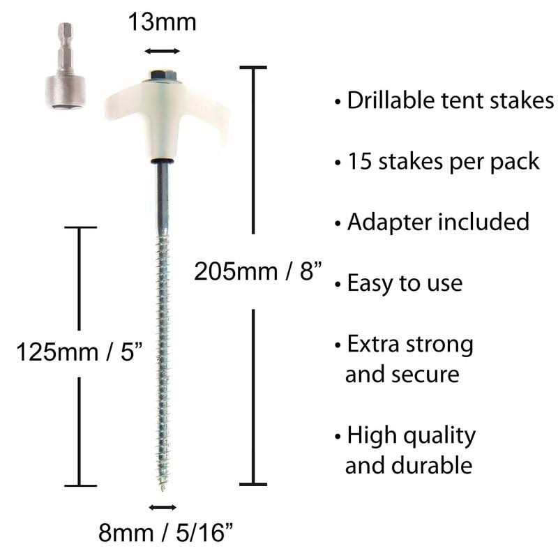 Drill-In Tent Stakes with Hex Drill Adapter and Convenient Pouch Storage Bag These awesome drill-in tent stakes make the task of anchoring your camp gear down so much easier! No longer do you need to spend time hammering your pegs into the ground – simply grab your drill or impact driver and quickly and easily drill your new drill-in tent stakes into the ground, anchoring your gear in a matter of minutes! FREE 13mm Hex Drill Adapter Included! INSTRUCTIONS FOR USE 1. Hold the Drill-In Tent Stake by the glow-in-the-dark head at a vertical angle to the ground. The head spins freely so as you drill into the ground, hold the head still and the stake will drill easily into the ground. 2. Once you have almost reached the ground, ensure the hook is facing towards the ground and loop your guy lines or other camping gear under the hook before drilling the remainder of the stake into the ground. 3. IMPORTANT Removal of the stakes: When removing the stakes from the ground it is important that you hold the head and pull with a small amount of pressure as you are drilling the stakes out of the ground. This is to ensure that the o-ring and washer stays in tact and does not get left in the ground.