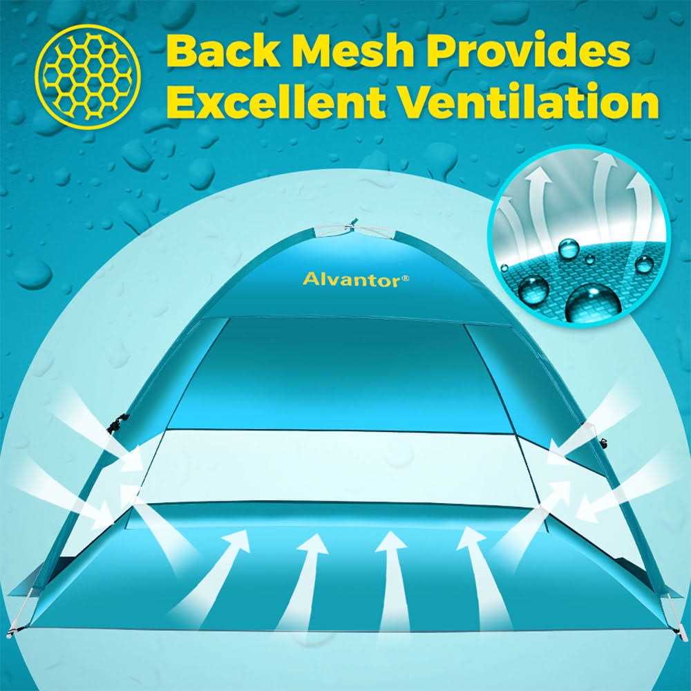 Alvantor Beach Tent Coolhut Plus Beach Umbrella Sun Shelter Cabana Automatic Pop Up UPF 50+ Sun Shade Portable Camping Fishing Hiking Canopy Easy Set Up Light Weight Windproof Stable 3 or 4 Person Description SUPER EASY UP DOWN This beach tent sun shelter POP UP AUTOMATICAALY instant in a second. Sets up less than 30 seconds. Folds down handy twist or figure 8 into roomy portable carrying bag no need to struggle with this foldable beach sun shelter.ONLY 3 lbs. LIGHTEST SUN SHADE BEACH TENT on the Market new fiberglass frame which is safe durable and rust free makes tent stably stand by itself and keeps shape after long time use. The new frame is 100% hassle free without those safety problems.INNOVATIVE DESIGN 50+ UPF UV protection and water resistant fabric for walls and floor. 3 side mesh provides excellent ventilation. Includes 3 sand pockets and 4 extra sandbags plus 4 stakes. This pop-up beach sun shelter is windproof up to 25 mph.VERSATILE USAGE This beach tent measures 79 x 53 x 47H which comfortably fits 34 people of family. Used as a canopy beach umbrella or sun tent it can provide cool all-day shade at park beach lake camping hiking fishing or weekend trip.100% SATISFACTION as US based company Lavatory is a registered trademark.