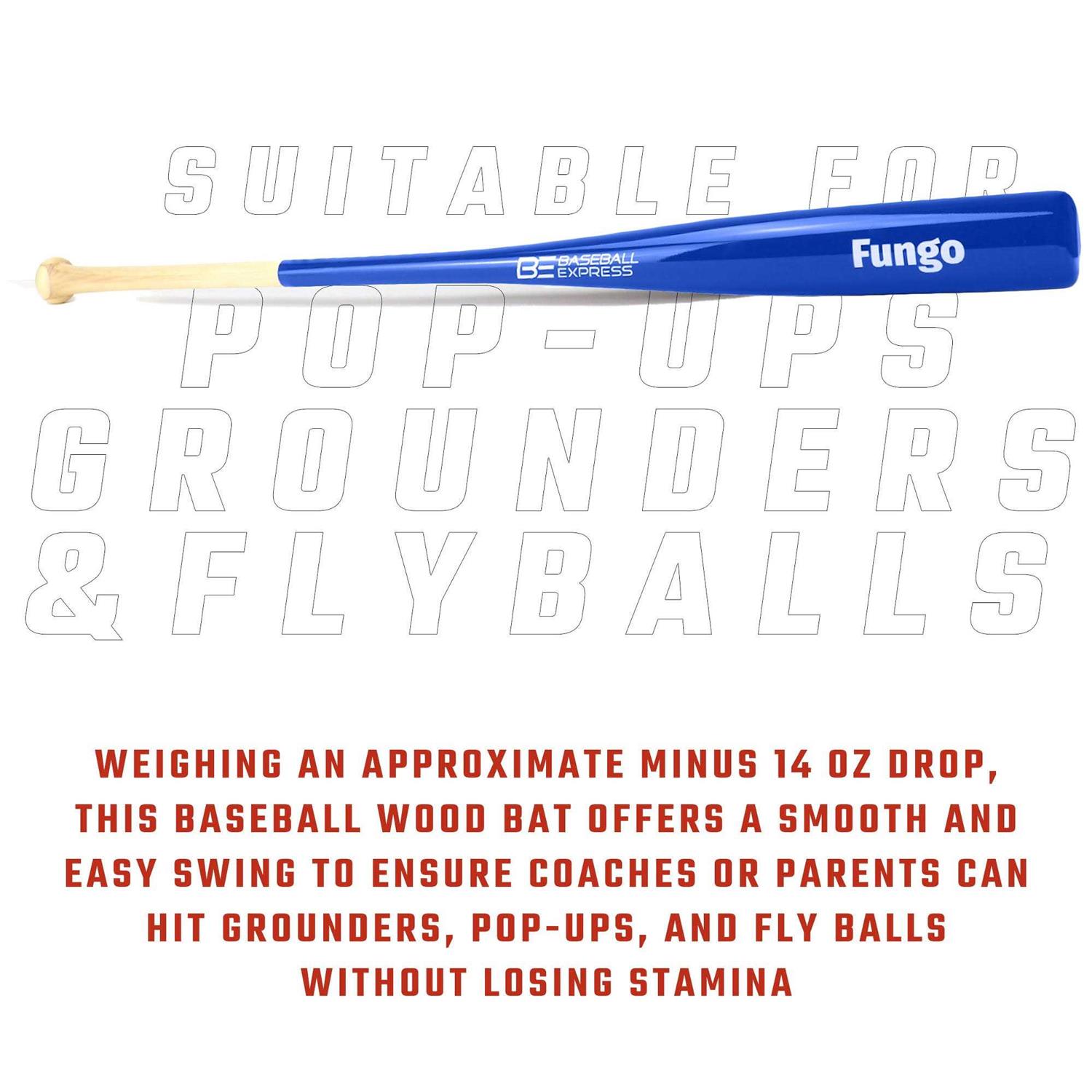 The Baseball Express fungo bat is great additional tool for any and all coaches. They allow you to elevate your teams practice and train just like the professionals. Fungo bats are a type of training bat that is super lightweight in construction and designed to be used by coaches for defensive practice. The minimal weight of the bats allows you to hit fly balls and ground balls with less effort, so you wont tire out your arm during practice. They are extremely easy to use. All you need is a soft toss, a tee, or you can even toss the ball yourself, and then you can effortlessly hit the ball with control and power to different parts of the field. The Baseball Express fungo was was constructed from laminates of hand selected maple hardwoods. The high quality wood used in this bat will last and give you the same pop practice after practice. It comes in 34 inch and 36 inch lengths with a minus 14 drop weight. This fungo is not cupped.
