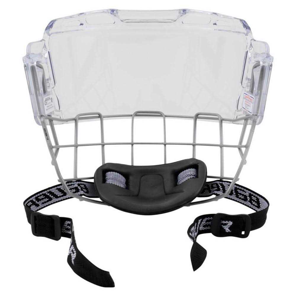 The Bauer Hybrid Hockey Helmet Shield is a great choice for the player who wants the visibility of a shield with the breathability of a cage. The Hybrid Shield features a tough Polycarbonate construction, utilizing an anti-fog interior coating and an anti-scratch exterior coating. The cage is constructed of a strong, oval-wire frame design that is optimized for breathability and visibility. It is also designed to fit on all Bauer masks and most others. A dual density chin cup offers protection and comfort and floats independently of the cage to sit tight to your chin at all times. The chin cup also has built-in moisture channels to keep you feeling dry. Compatibility Compatible with most certified hockey helmets and will fit on all Bauer helmets.