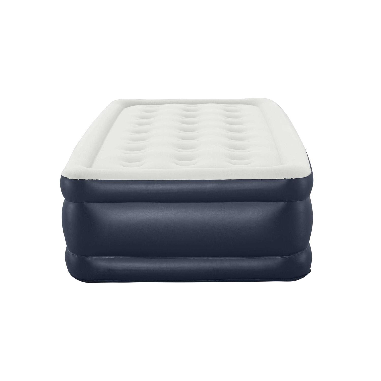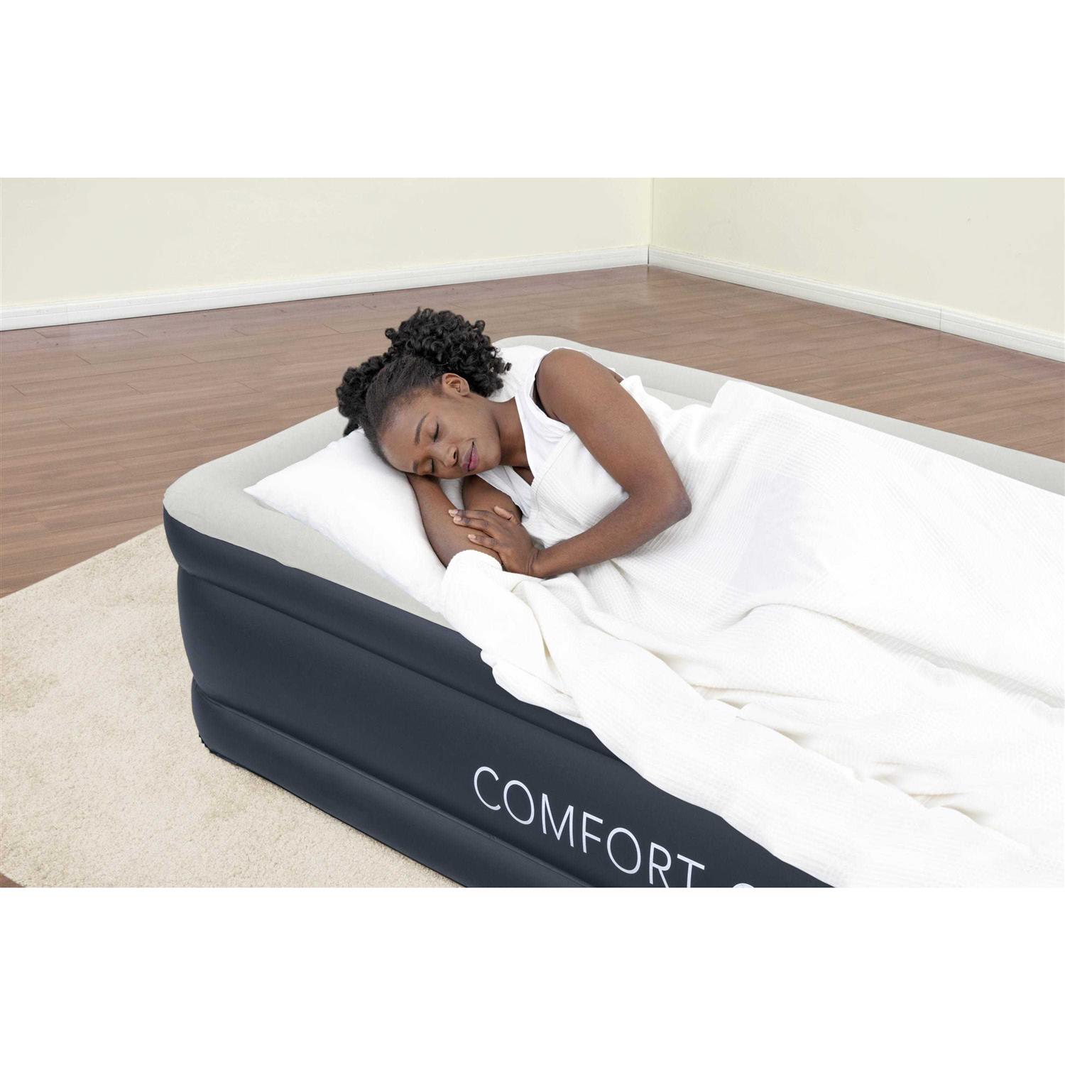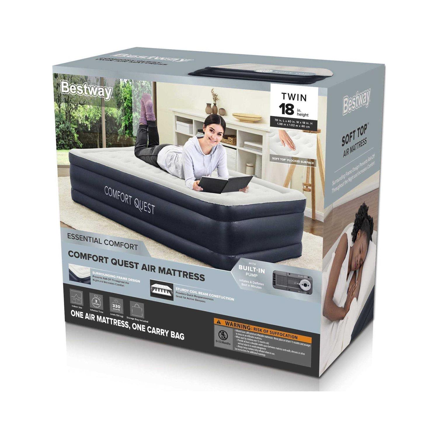 The Bestway Comfort Quest Twin Air Mattress provides a refreshing night’s sleep, whether you’re at home or on the go! Its compact size and built-in AC pump make it quick and convenient for use whenever you need it.Durable Construction:With a comfortable sleeping surface and sturdy construction, a great night’s sleep is right around the corner. The sturdy coil beams are specifically designed to mimic the springs in a traditional mattress. Great for active sleepers, this internal construction provides quick responsiveness to body movement. The bed also features a surrounding frame to prevent roll-off during the night and increase comfort. Simple Setup: This air mattress inflates in 3 minutes so it is ready for bed when you are. The built-in pump allows for easy inflation and quick deflation after use. Simply place your flattened bed in the included carrying bag for easy transport and storage.