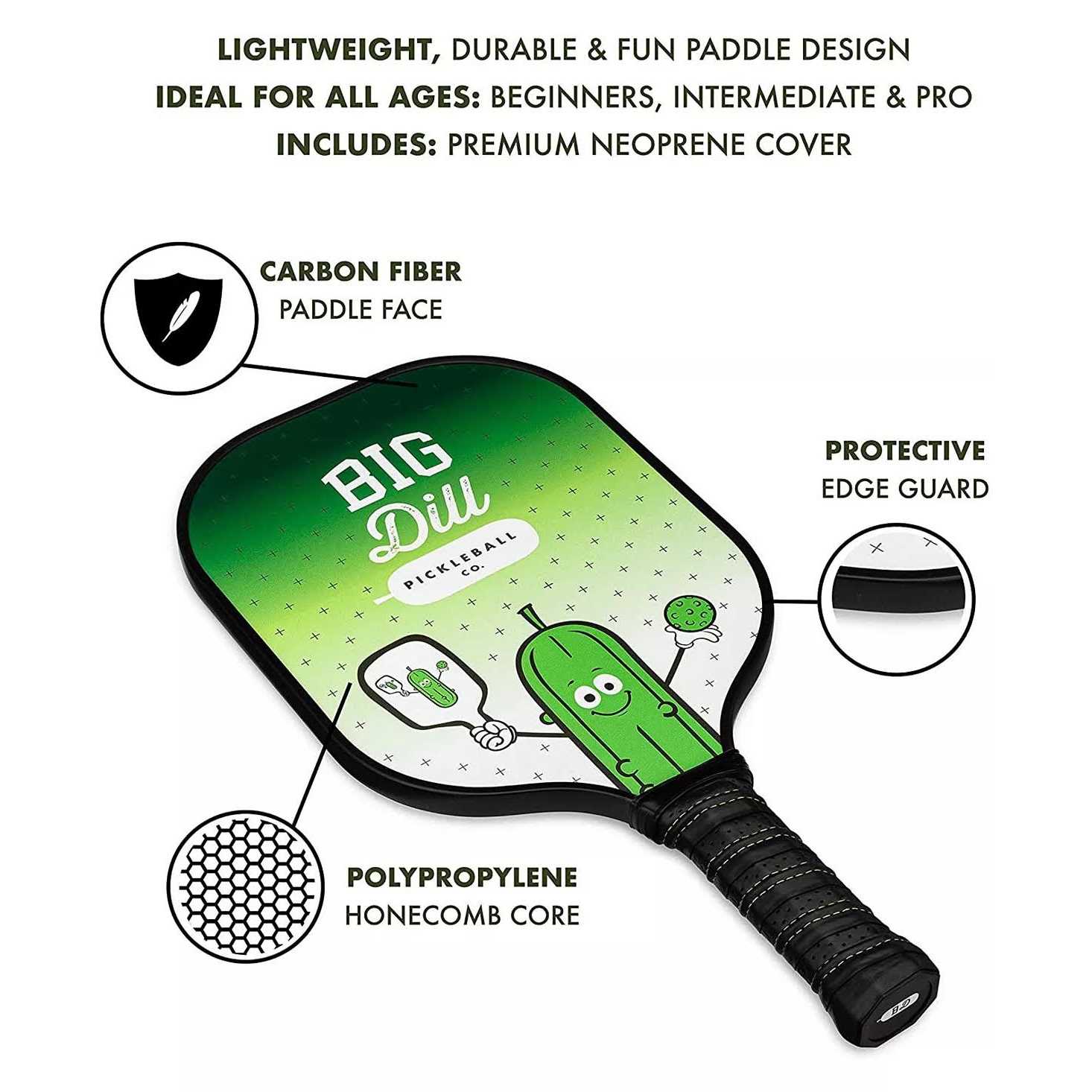 Big Dill’s Set: 2 paddles (7.8×15.6″, 7.8 oz, carbon-fiber, edge Guard), 2 outdoor pickleballs, green logo bag. Paddles have honeycomb core and 4.5-inch cushioned grip. Suitable for all levels, indoor/outdoor. Each paddle includes a neoprene cover.