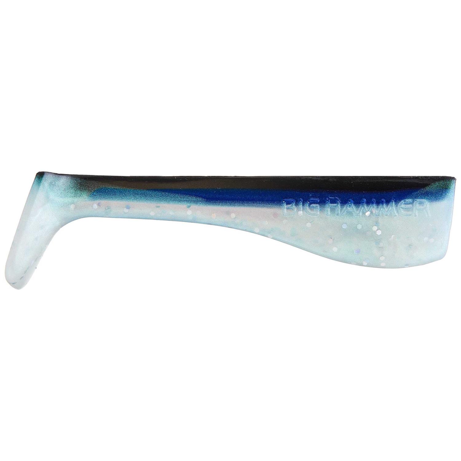 The 4 inch Big Hammer swimbait is the ideal size for trying swimbaits on nearly all bodies of water. It was designed to fit on a heavier jig head than most of the other Big Hammer designs. This makes the 4″ Big Hammer swimbait ideal for fishing deep, in strong currents, pitching through holes, crawling down steep ledges, swimming over the top of deep structure, fishing the slide, and trolling. The short, stocky body has less drag than other designs allowing the bait to fall to the bottom quicker when rigged on a heavy jig head. And when trolling it is more forgiving than other designs and will not have the tendency to roll at higher speeds if not rigged perfectly straight. On a lighter jig head such as the 3/8 oz. 4/0 the action is enhanced further due to the protruding edges on each side of the front of the swimbait when rigged.