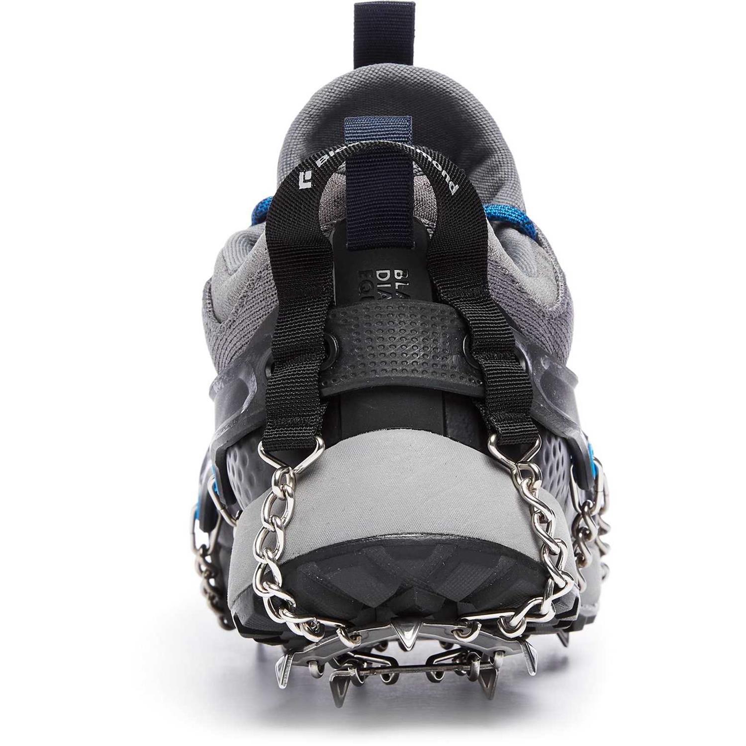 Black Diamond built the Access Spike traction device for all-round trail performance. A workhorse piece, it can be used for running and walking alike. Featuring 14 stainless steel spikes that are heat-treated for durability, they bite into the ground, increasing grip on snow and ice and enhancing stability on rocky terrain. A durable elastomer harness hugs the shoe, with a heel webbing loop that aids donning.These are not crampons. They are not designed for mountaineering, winter hill walking or any steep terrain where proper crampons are required.