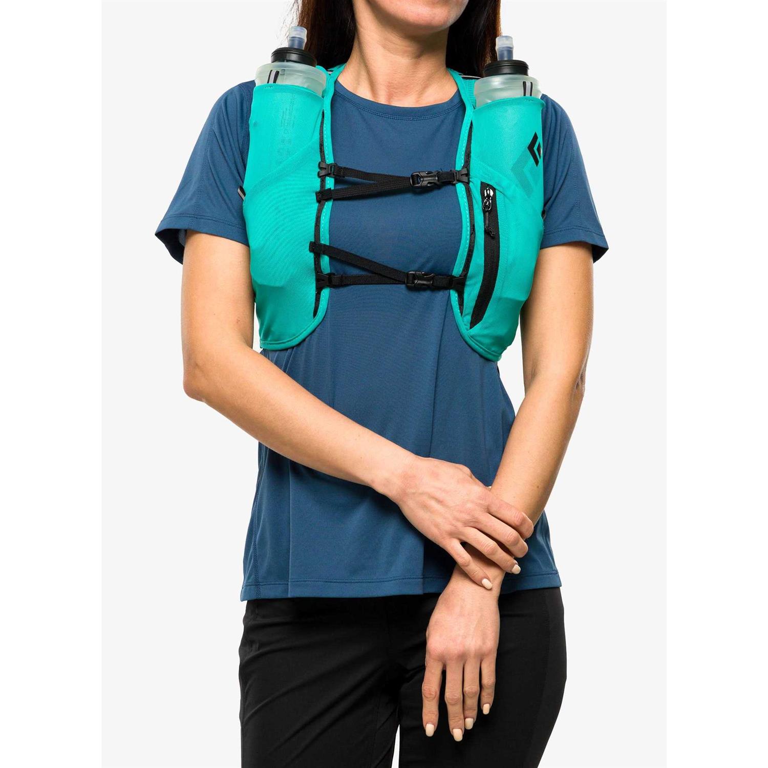 Black Diamond Women’s Distance Hydratation Vest is a trail running backpack designed for women taking on long distance races and fast paced adventures. It features a running harness suspension made of comfortable stretch material that extends from the hips to the back, with self-tie stretch mesh edging for maximum comfort on the move. The women’s specific version fits shorter bust lengths with a shoulder strap shape that focuses on curvature and neck width for all-day comfort. The Z-shaped pole carrying system can be easily used on the move. The harness design also offers quick-access side pockets. The double gusset pockets accommodate two BD HydraPak SoftFlasks .