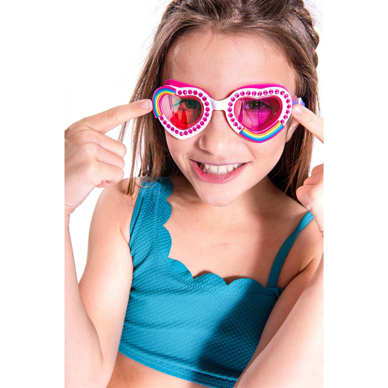 All you need is love, but some added sparkle doesn’t hurt! One and Only Pink features a heart frame full of rhinestones and rainbows sure to brighten anyones day. A look as colour as can be, completed with a sorbet swirled strap featuring a silicone rainbow ‘LOVE’ slider. This set is suitable for children aged 6 years+. You can customise the fit of these goggles by quickly and easily adjusting the head strap. Bling2o goggles offer a variety of features proving they are the real deal! Our goggles are 100% silicone, latex-free, with a lens that offers maximum UV protection and an anti-fog coating. Each set of goggles comes with its own uniquely designed hard carry case to keep them protected when not in use. Bling2o is the perfect gift for any occasion!