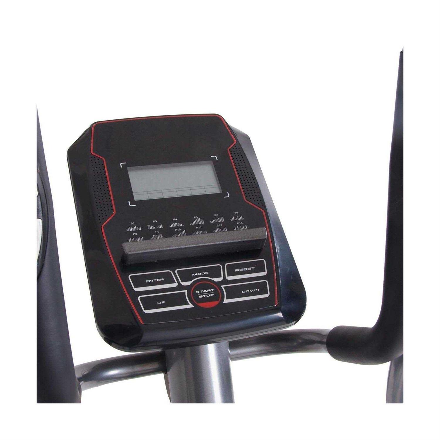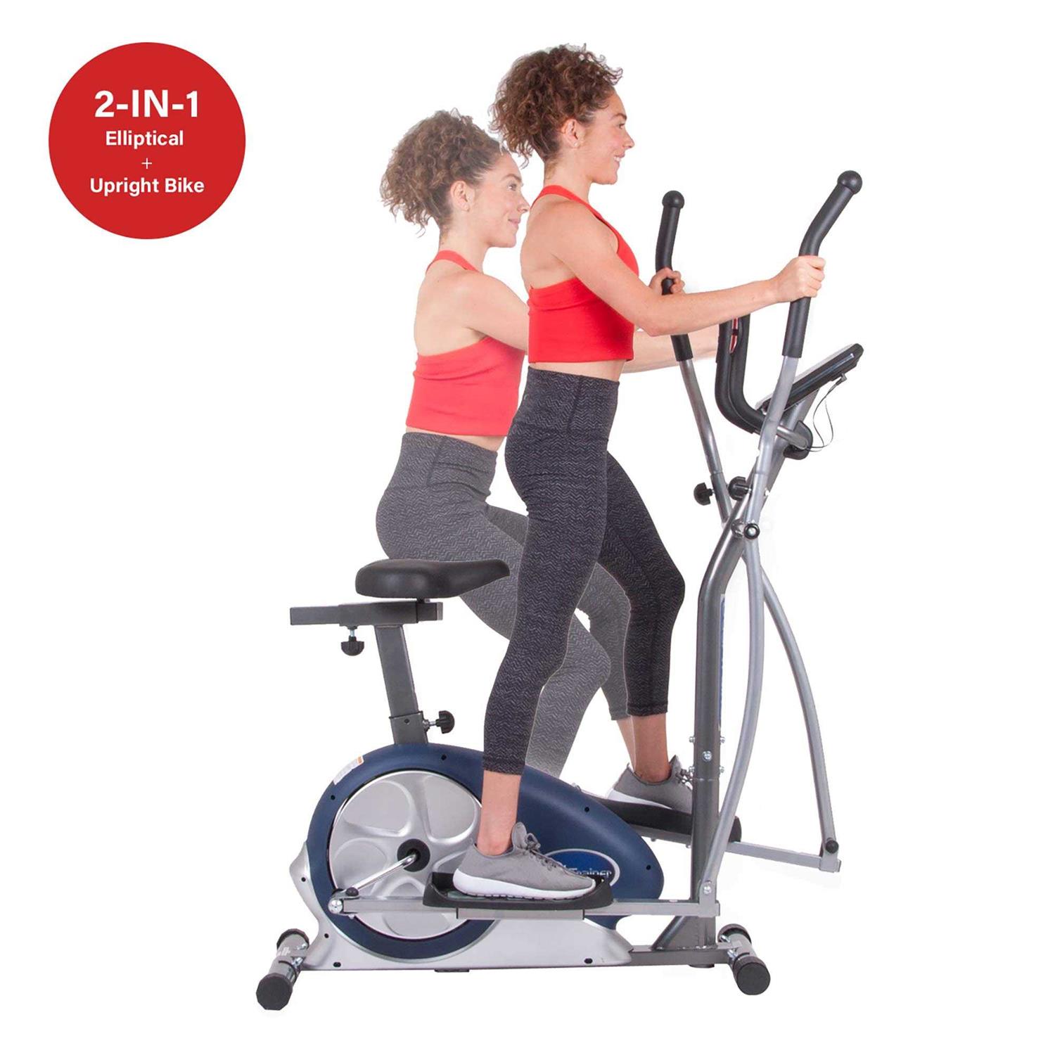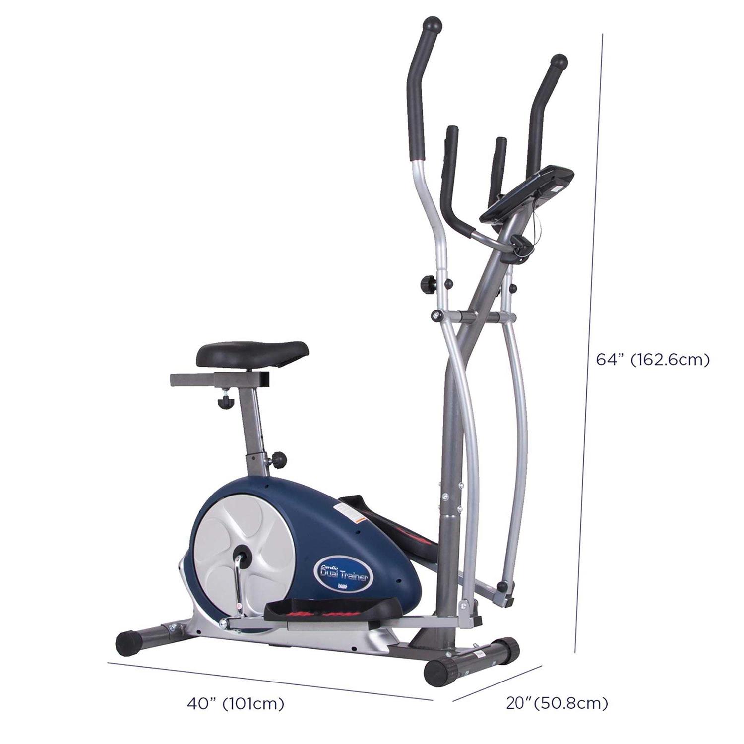 Assembled dimensions: 38.63L x 12.63W x 63H inches. Functions as elliptical or exercise bike. 13-inch stride length/16 resistance levels/20 programs. Includes workout DVD. 250-pound weight capacity. Manufacturer’s warranty included (see product guarantee). Get the body that you always wanted with the Body Champ BRM3671 Elliptical Dual Trainer with Seat. The seat adjusts to fit different heights letting you share the exercise machine with others and the padded seat offers a level of comfort during your workout. It functions as both an exercise bike and an elliptical giving you multiple ways to exercise. An included DVD features additional routines that you can do on the piece and it has twenty different programs that let you work your way up to the more advanced levels. Vary your exercise regimen by choosing elliptical or exercise bike Patented 2-in-1 design enhances cardio health. Features a programmable LCD console that allows you to set up to 20 programs. Programs include workout programs heart rate-driven programs and user customizable programs. Adjustable seat moves vertically or horizontally to accommodate all sizes of user. Operates with motor-driven magnetic adjustable resistance system. Durable steel frame construction Some assembly required.