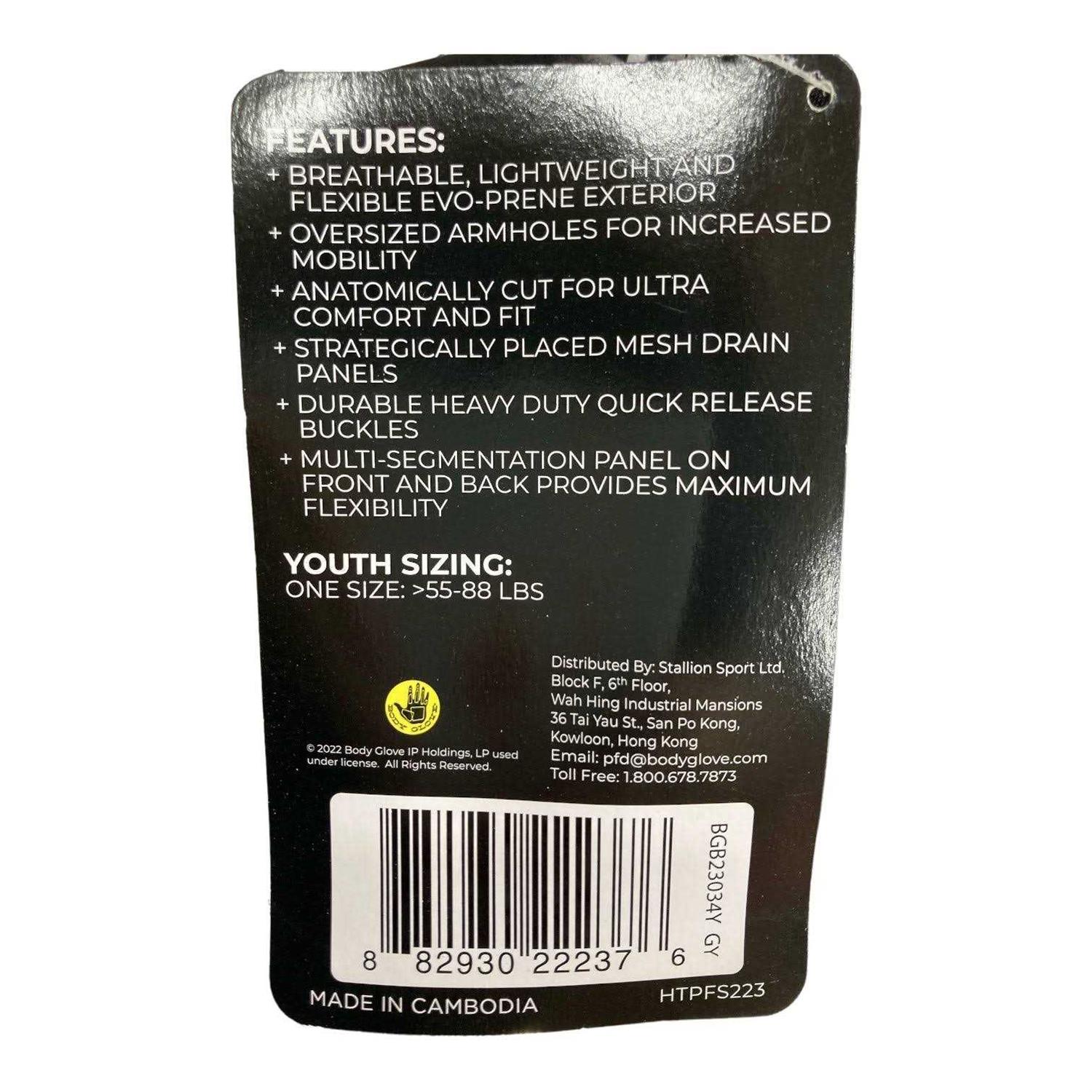 The Body Glove Youth Segmented PFD offers a lightweight, durable, yet flexible fit that does not hinder the users action while wakeboarding or riding on a PWC. The multi-panel design will increase the range of motion, which provides increased mobility and comfort. An updated inner liner allows for more airflow throughout the vest, allowing it to dry quickly with a more comfortable fit. The Body Glove Youth Segmented PFD is the essential vest for your water sports needs.Features & DetailsThis PFD features strategically-placed mesh drain panels, while durable heavy-duty quick-release buckles make it easy to get off. Anatomically cut for ultra comfort and fit, it’s ideal for young ones weighing 50-90 lbs. The multi-segmentation panel on the front and back provides maximum flexibility. The Body Glove Youth PFD features a breathable, lightweight and flexible EVO-PRENE exterior.