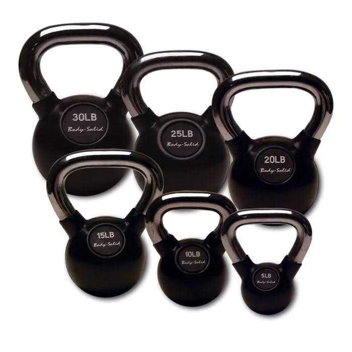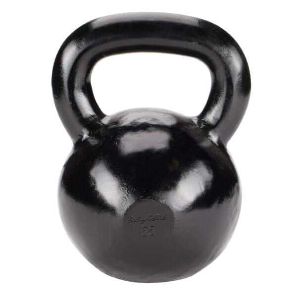 Iron Powder Coat Kettlebells 5-100 Pounds Body-Solid KBR Kettlebells feature a durable matte-black chip-resistant powder-coat finish and easy-to-read weight displayKettlebells have become one of the most popular trends on the health club scene. On any given day, you can see everyone from housewives to celebrities to business executives or professional athletes and trainers performing the most advanced kettlebell routines with perfect form. Now thanks to Body-Solid, you can enjoy the many benefits of kettle bell training in the comfort and convenience of your own home.Kettlebells are cast iron weights, which resemble a cannonball with a handle. A legendary Russian exercise device, the kettle bell has long been a favorite for those seeking a special edge in strength and endurance. Kettlebell training develops strength, power, endurance and balance. Kettlebell workouts have long been a favorite of throwers, jumpers, sprinters and hurdlers. You can perform squats, pulls, overhead throws and rotational training plus much more.