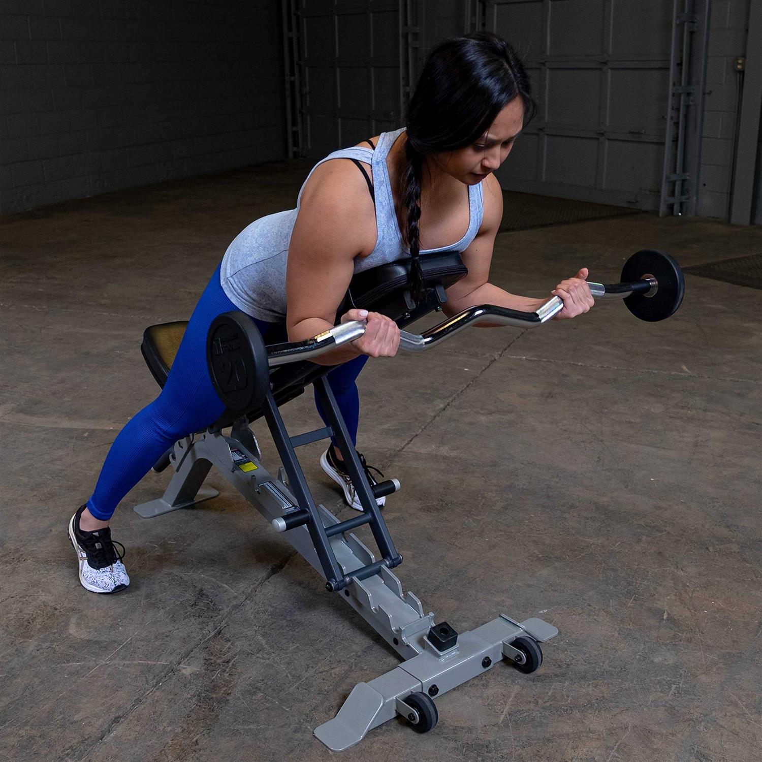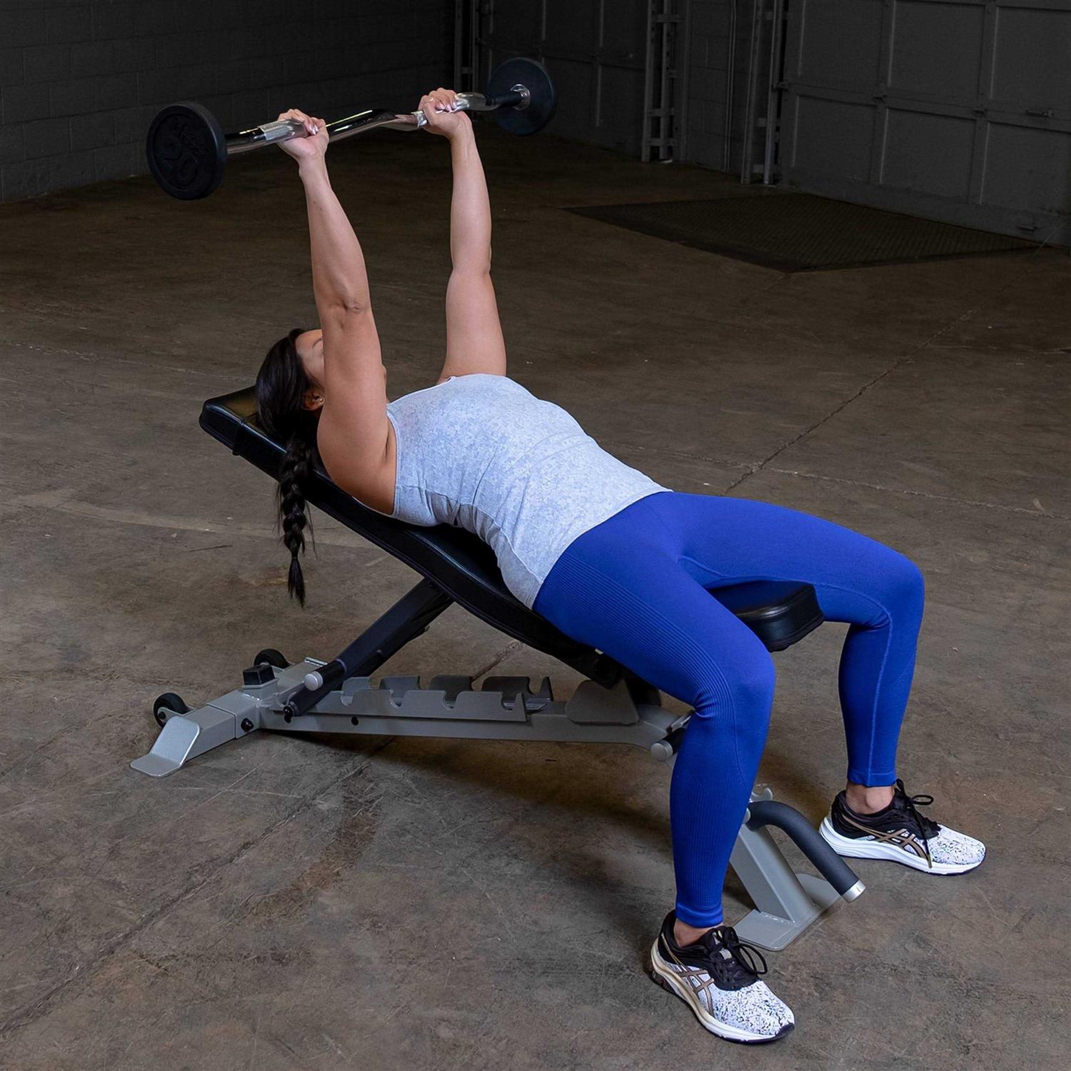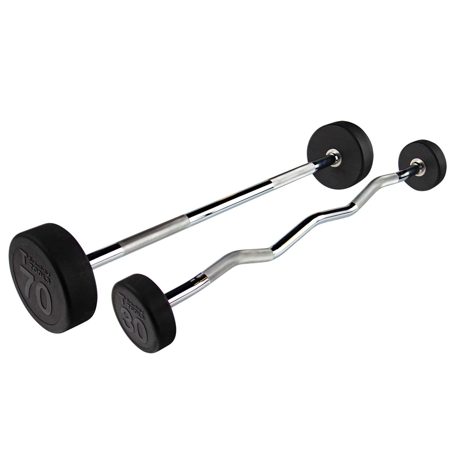 Body-Solid Tools SBZ Fixed-Weight EZ Curl Barbells are available in 10 weight options (20-110 lbs) and offer a convenient, time-saving barbell option. Constructed with high-quality precision weighted steel inserts encased in durable rubber, Body-Solid Fixed-Weight EZ Curl Barbells eliminate the need for weight plates and are a perfect fit for any-sized fitness facility, group workout facility or home and garage gym. Use the SBZ EZ Curl Barbells for several biceps and triceps movements including curls, skullcrushers, preacher curls, triceps presses and more. Each SBZ features precise knurled grips to ensure safe and secure handling even during intense workouts.