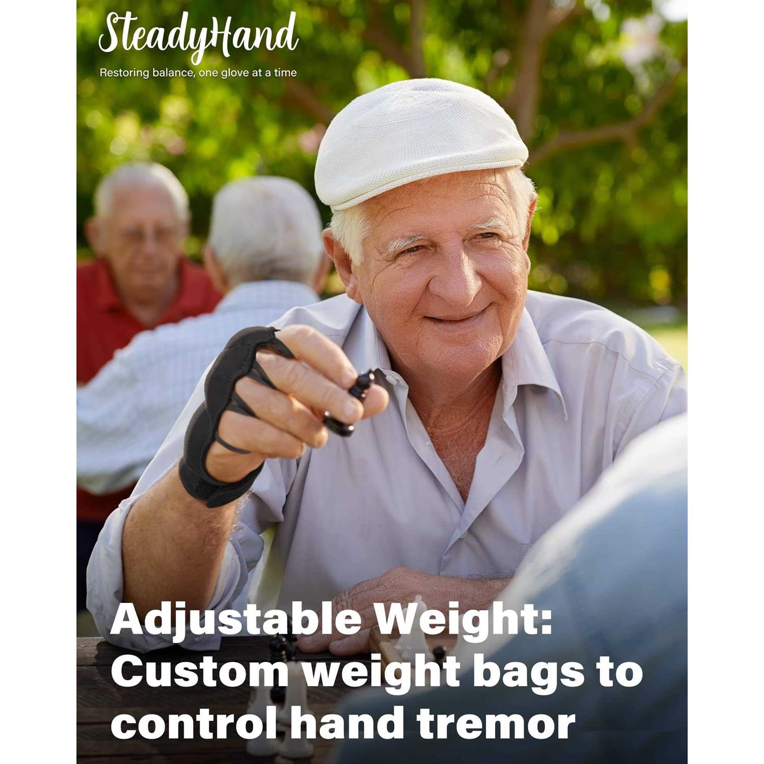 Enhanced Stability and Comfort: SteadyHand Weighted Glove provides personalized stability and control for hand tremors. With adjustable weights and 5 size options, it caters to various age groups, ensuring a comfortable fit. Open Palm Design for Unobstructed Grip: Our glove’s open palm design allows a natural grip without interference, enabling easy handling of objects. Adjustable Weight for Personalized Use: The glove’s adjustable weights support muscle strengthening, grip enhancement, and improved hand dexterity. Versatile Usage: Ideal for writing, eating, and daily tasks, SteadyHand Glove seamlessly integrates into routines for enhanced independence. Empower Your Confidence: SteadyHand allows you to regain confidence in your hand movements, offering a natural and supportive solution to manage tremors. SteadyHand Weighted Glove provides personalized stability and control for hand tremors. With adjustable weights and 5 size options, it caters to various age groups, ensuring a comfortable fit.