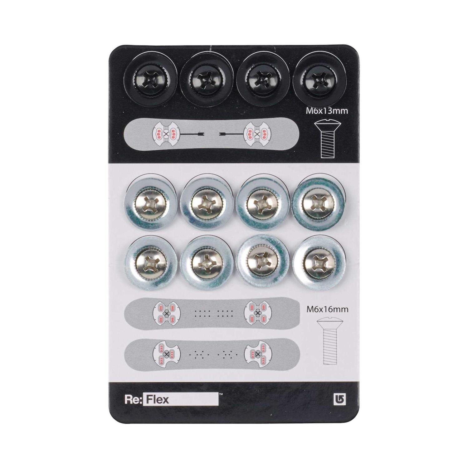 Don’tlet a lost screw leave you stuck on the couch. The full set for mounting Burton Re:Flex bindings to either The Channel, 3D, and 4×4 snowboarding mounting patterns. Includes eight silver M6x16 screws and washers for 3D and 4×4 mounts as well as four black M6x13 screws and washers for The Channel mounting system. Don’t screw with random collections; use the correct hardware to ensure a proper mount.