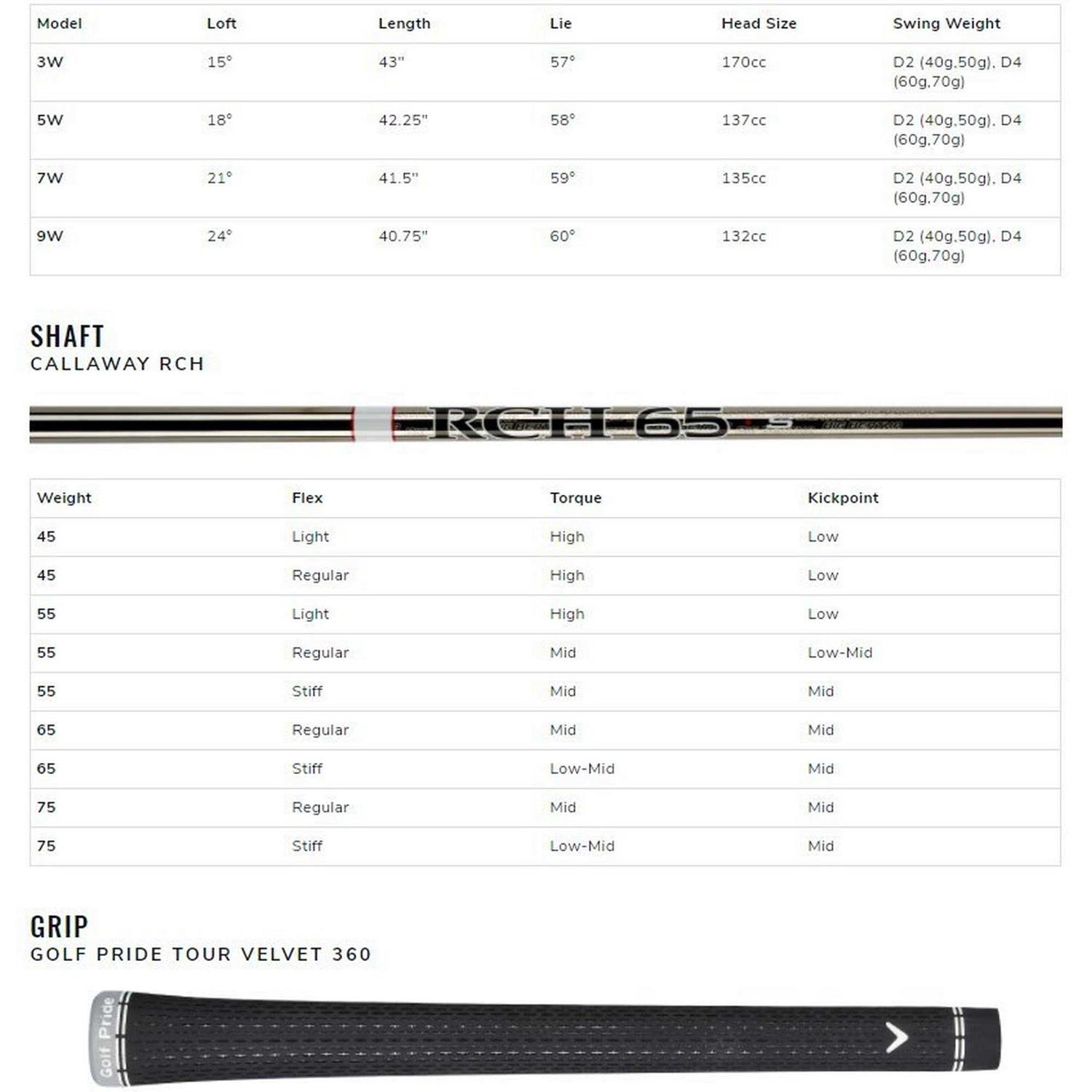 The New Big Bertha B21 Fairway Woods Not all golfers are comfortable hitting the ball off the ground with the same enthusiasm as they do off the tee. Slicing the ball, poor contacts and carving out huge divots can all play on the mind and cause an increase in tension that can make the worst fears come true. The ideal solution is a club that is super easy to launch from the ground and will be forgiving of mishits while still delivering game improving power. The new Callaway Big Bertha B21 fairway wood is intended to give you the confidence to gain control and distance any way you swing it. Getting the slice out of your game is the aim of the new Big Bertha B21. A shallower face, progressive lengths and more forgiving head design makes these new fairways more like a hybrid when it comes to striking the ball but the resulting distance is the telltale difference. In this incredible new club you’ll also find Callaway’s industry leading technologies like the legendary Jailbreak Bars and the A.I design Flash Face SS21. All in all these are great confidence boosting fairways that will get you closer to the green than ever before and reduce the frustration of ending up out of bounds. Callaway Big Bertha B21 Fairway Features Easy To Hit A shallower face, progressive lengths, and an oversized Bertha shape promote consistent contact and smooth turf interaction. Straighter Ball Flight From Increased Offset Callaway have added offset to reduce slices and promote distance-enhancing draws. High Ball Speeds From Flash Face SS21 and Jailbreak Technology The advanced A.I. design promotes fast ball speeds across an expansive area of the face while Jailbreak bars connect the crown and sole to increase stiffness and promote even more speed. Premium Components Features a completely new RCH shaft, designed by Callaway to specifically enhance the Big Bertha offering, with an Active Tip Flag section for easy launch. And it comes stock with a Golf Pride Tour Velvet Soft Grip.