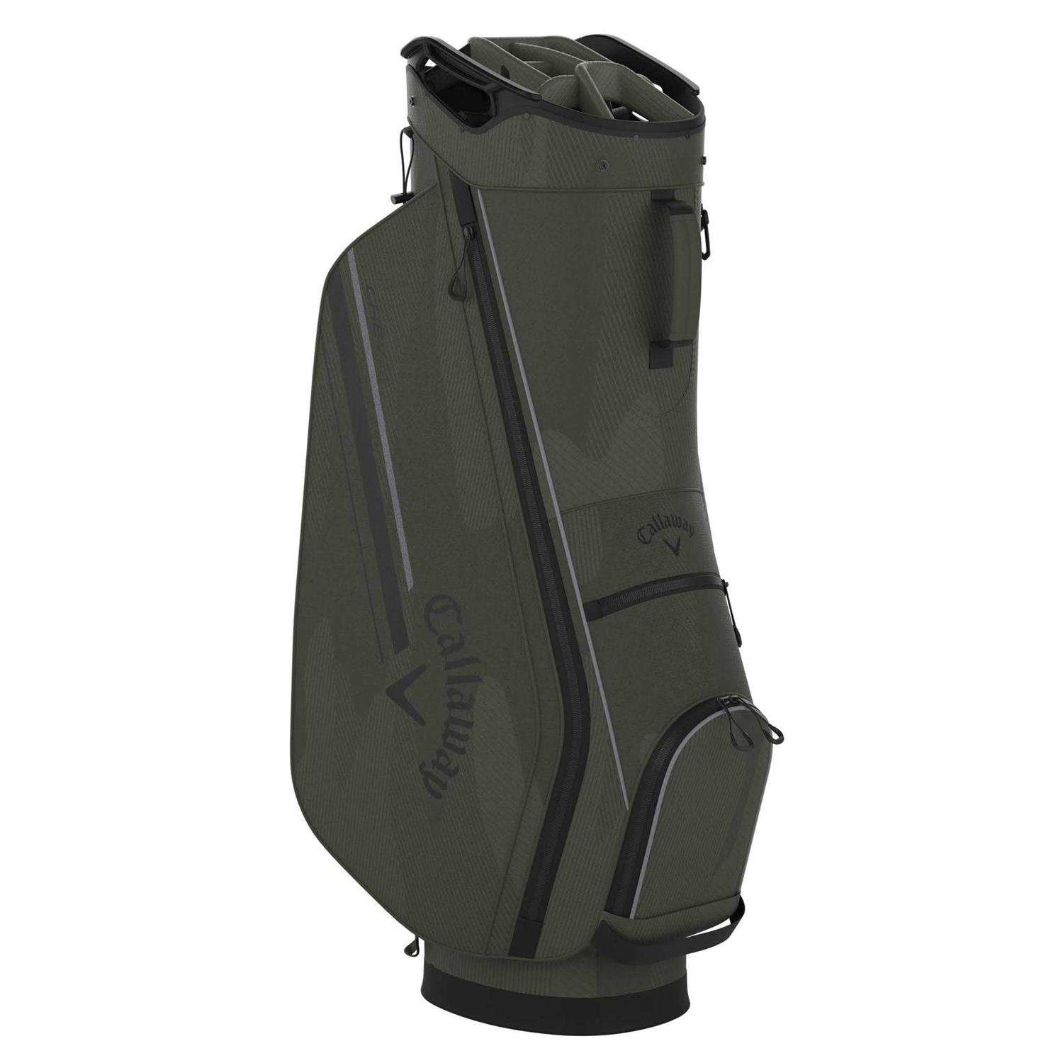 The Callaway Chev 14 cart bag is lightweight weighing in at 4 pounds. It features a 14 way top with full length dividers that provide club protection. The bag is equipped with 5 pockets for carrying personal items and golf accessories. Featured pockets include a spacious cooler pocket a water resistant velour lined valuables pocket a customizable ball pocket and 2 full length apparel pockets.