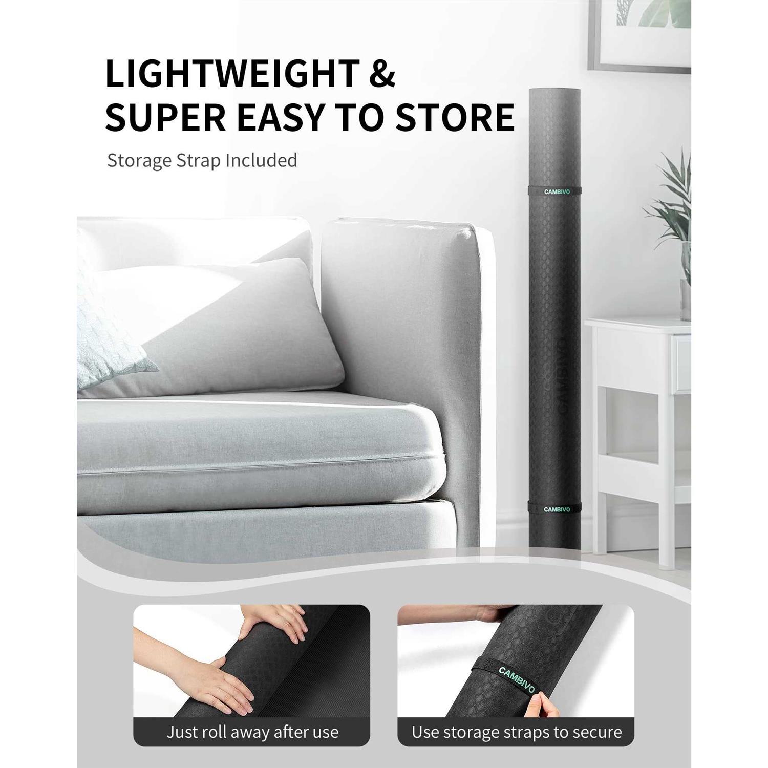 Large Exercise Mat: Extra length and width(72″x 48″), You will never feel restricted or limited by the size of this fitness mat; Extra-large space allows you do any Yoga Poses, Pilates, Stretch, Foam Rolling, Cardio Workouts, Meditations and various barefoot bodyweight trainings like Squats, Lunges, Push ups, Plank Variations, and Calisthenics Wide Yoga Mat : Our large workout mat using Two-toned Textured slip free design so you can perform any movement with confidence; Wavy underside stops the mat from sliding on the floor; The laser graved surface prevents hands and feet from slipping out of position so you can hold poses no matter how vigorous your practice gets and whether you’re practicing on a wood floor, or tile (Not recommended for using on a rug) Excellent Home Gym Partner: The extra thick 6mm mat and the textured surface stabilizes your body, relieves pressure points in all yoga postures, aids in balance to hold postures longer and protect your joints and knees without compromising support or stability; Perfect for beginners, pros and yoga trainers, perfect for fitness exercises or rehabilitative purpose Versatile & Convenient: This fitness yoga mat is designed very lightweight and comes with storage straps that allows you to take it with you at work, at the gym, camping and much more; Great for yoga, sit-ups, push-ups, aerobic exercises, outdoor camping and much more; Roll it for convenient storage after use; A must-have for every yoga enthusiast Package Included: Each package contains 1 Large Yoga Mats, 1 Microfiber Towel, and 2 Storage Straps;Keep doing exercise at home, drink plenty of water, and sleep well to boost your immunity and help you stave off colds Cambivo TPE yoga mat is mainly composed by Thermoplastic elastomers and other material closed-cell foamed under high temperature which makes it anti-microbial and easy to clean. This mat is skin-friendly with the characteristics of non-PVC, non-toxic, non-heavy-metals and non-irritating odor. Soft & Thick with superior cushioning to protect your joints, while providing firm, stable support for standing postures. Its good elasticity, durability, and lightweight making it suitable for travel and household use. Features: Soft & Thick with Superior Cushioning to Protect Your Joints High elasticity and resilience Superior grip (wet and dry) Super Lightweight & Easy to Carry Repels Moisture, Bacteria & Odour Hypo-allergenic contains no latex, rubber Recyclable and reusable Available Colours: Blue, Black, Purple Thickness: 6mm Dimensions: 72″x 48″ (183cm x 122cm) Package Include: 1×Premium Extra-Large Fitness Mats 1×100% Microfiber Towel 1×Storage Bag 2×Storage Straps Care Instruction: 1. Dry the Fitness Mat with a towel after use 2. Wipe the Fitness Mat with a damp cloth to clean, Air dry 3. Avoid exposing the Fitness Mat to heat or excessive sunlight 4. Store in a cool, dry place Note: TPE mats are designed to naturally biodegrade. Please do not put to dry in the hot sun for prolonged periods.
