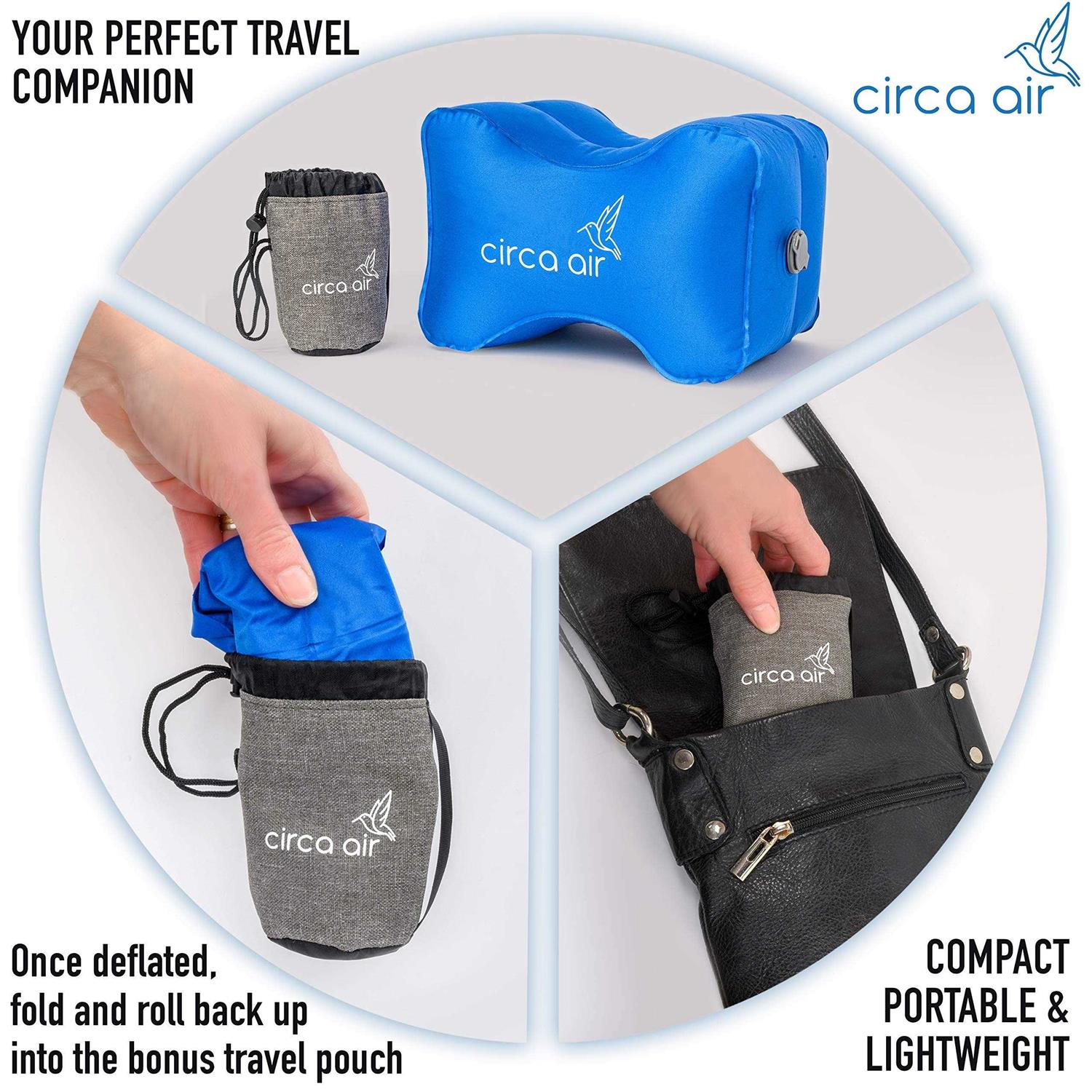 Does Sciatica Pain, Lower Back Pain or Hip Discomfort Keep You Awake At Night? The Circa Air Knee Pillow could be the solution you’ve been searching for. With comfort, support and convenience in mind, the Circa Air Inflatable Knee Pillow has been designed to promote a healthier sleeping posture which can help you with the following issues: Hip Pain Reduce Back Pain & Sciatica Joint Pressure Knee Pain Pregnancy Related Sciatica Post Injury It’s great for side sleepers! Just slip the knee pillow between your legs when sleeping. It can help to keep your legs, hip and spine in alignment so that you can get a better nights sleep! Perfect Knee Pillow For Travel In addition, the inflatable design makes the knee pillow your perfect travel companion. It’s super light. Unlike other traditional foam knee pillows that are often big and bulky, this knee/ hip pillow weighs just 0.13 pounds ! It’s easy to inflate/deflate. When not in use, simply fold it up and place it back into the BONUS small travel pouch provided. It’s so small it can fit in your pocket, making it so convenient, you can take it anywhere with ease! Don’t wait. Order your Knee Pillow from Circa Air today!