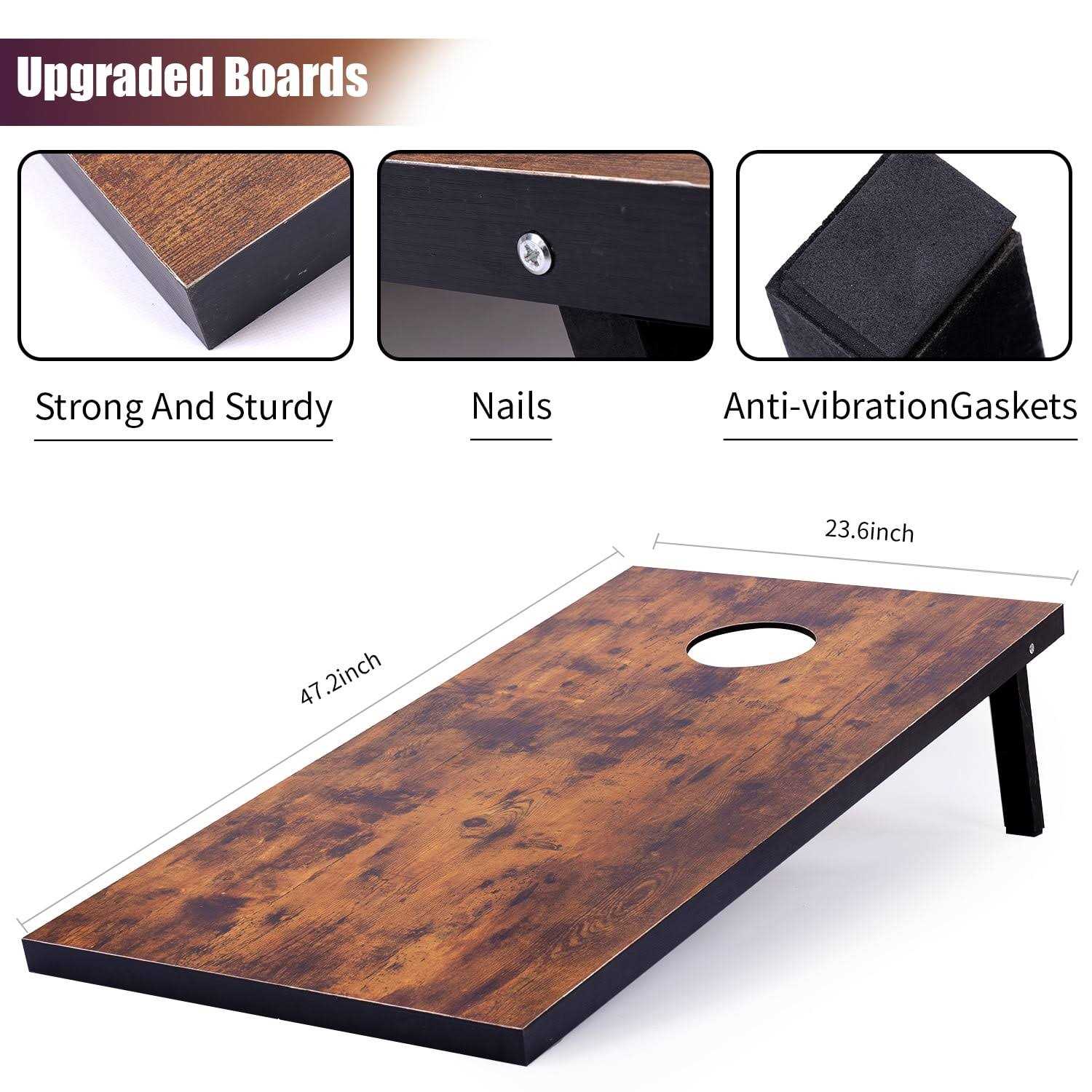 Cometoss cornhole outdoor game set includes two 47.2 inch L x 23.6 inch W x 1.5 inch H MDF wood boards and eight 6 inch x 6 inch 15oz dual sided toss bags (4 red and 4 blue ). The target board is designed with burning wood grain, board smooth surface. The cornhole set is equipped with a carrying case. 4’x 2′ Size is suitable for all occasions.The carrying bag can be used to pack everything up and protect the boards inside from dirt and moisture. Keep everything tidy and neat when you are not using them. The foldable legs of the corn hole game toss board are very easy to set up and helpful for saving space when storage.The two corn hole boards are attached together with velcro, With its lightweight construction and carrying case, our cornhole set is easy to take on the go. Great for barbecues,cookouts, campsites,parties, weddings, backyard fun and tailgating with friends great gift to friends.