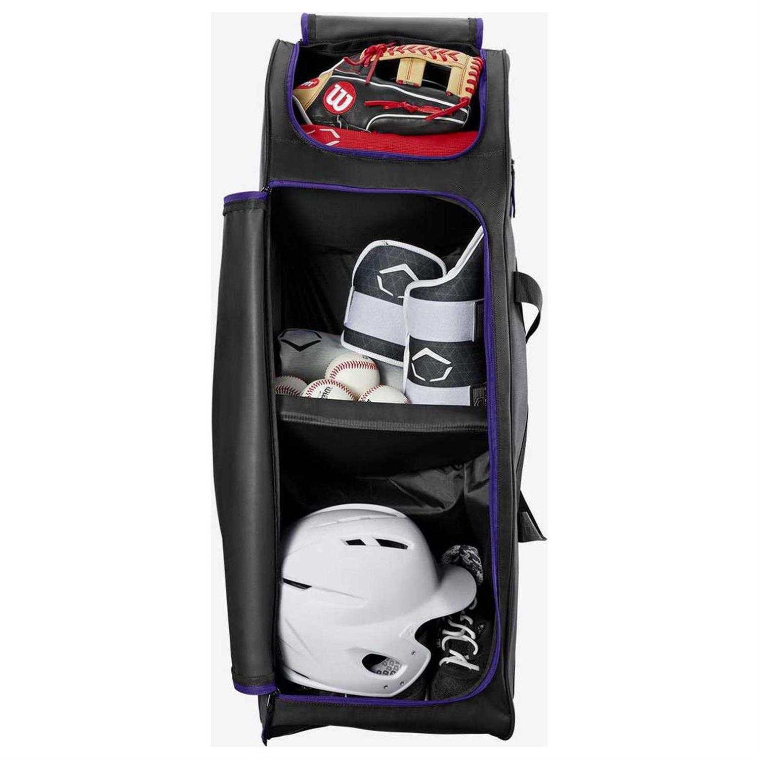 Equipment Bags by DeMarini. Details:Roll into every game with a loaded arsenal This season with the momentum 2. 0 wheeled bag. Designed with interior Shelving to keep your gear organized for easy access, two fence hooks for easy storage and bat sleeves for up to four bats, this bag is perfect for serious players ready to wreak havoc on opponents.