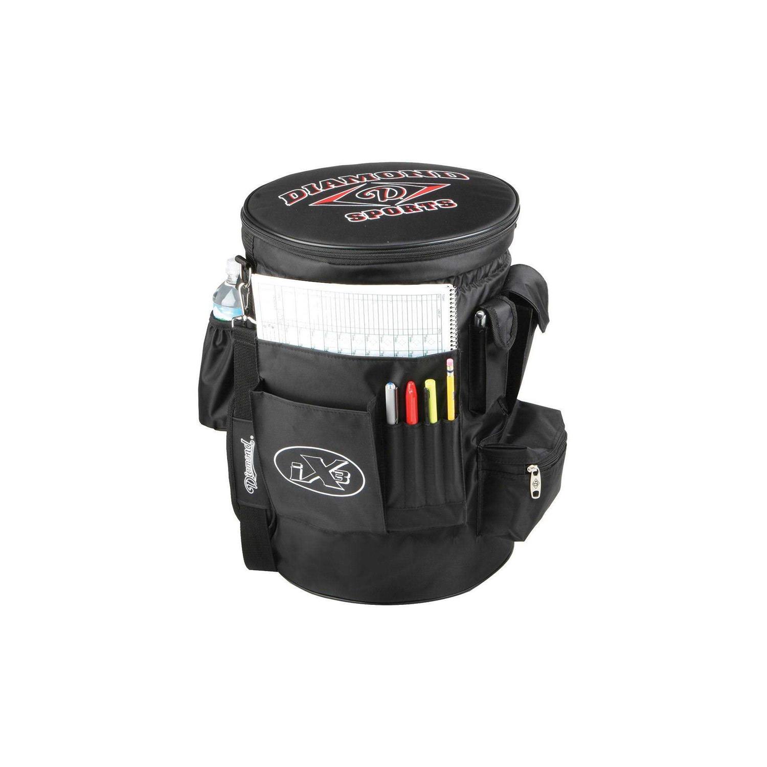 Diamond Sports Bucket Sleeve is a great organizer for your ball bucket. Designed for 6-gallon bucket it has a cinch band at the top that keeps sleeve up even when fully loaded. Padded seat top and adjustable shoulder strap and has team name ID window and mesh pocket for game balls. Pockets for water bottle, cell phone, sunglasses, scorebook, line up card, and pens. 18 inch x 13 inch.