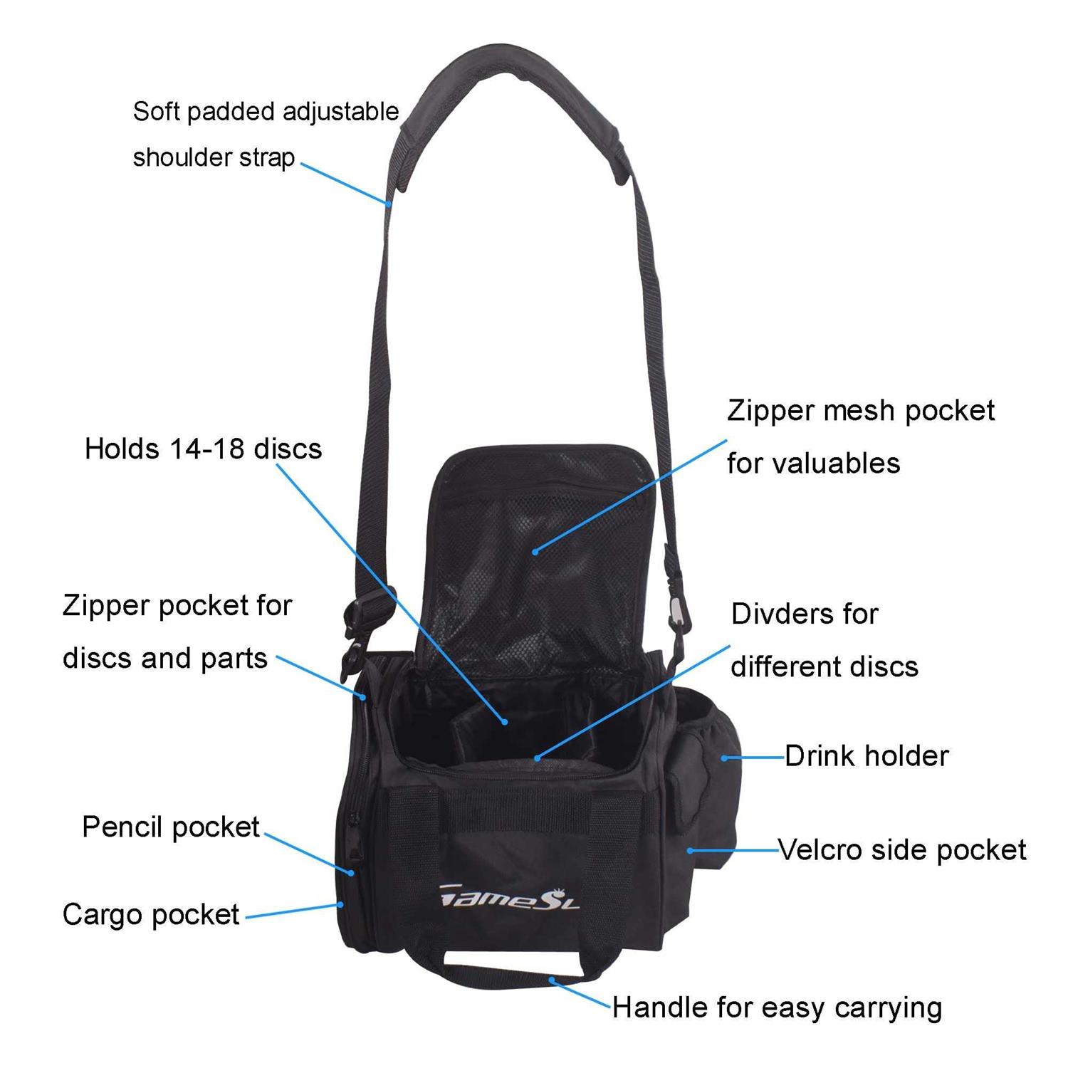 DISC GOLF SET: Includes 1pc heavy duty nylon carry bag,2pcs Drivers, 2pcs Mid-Ranges, 2pcs Putters, 1pc Mini Disc Marker and 1pc 12″x12″ embroider logo black towel. BAG:The bag included has 14-18 disc capacity,length adjustable soft padded shoulder strap, big size bottle holder, top mesh pocket for valuables, pencil pockets and Velcro side parts pocket. PLASTIC Material-Top quality heavy duty plastic make excellent feel in playing. A GREAT DISC GOLF STARTER SET for anyone who wants to start the game. br DISC GOLF SET: Includes 1pc heavy duty nylon carry bag,2pcs Drivers, 2pcs Mid-Ranges, 2pcs Putters, 1pc Mini Disc Marker and 1pc 12″x12″ embroider logo black towel. br BAG:The bag included has 14-18 disc capacity,length adjustable soft padded shoulder strap, big size bottle holder, top mesh pocket for valuables, pencil pockets and Velcro side parts pocket. br PLASTIC Material-Top quality heavy duty plastic make excellent feel in playing. br A GREAT DISC GOLF STARTER SET for anyone who wants to start the game.