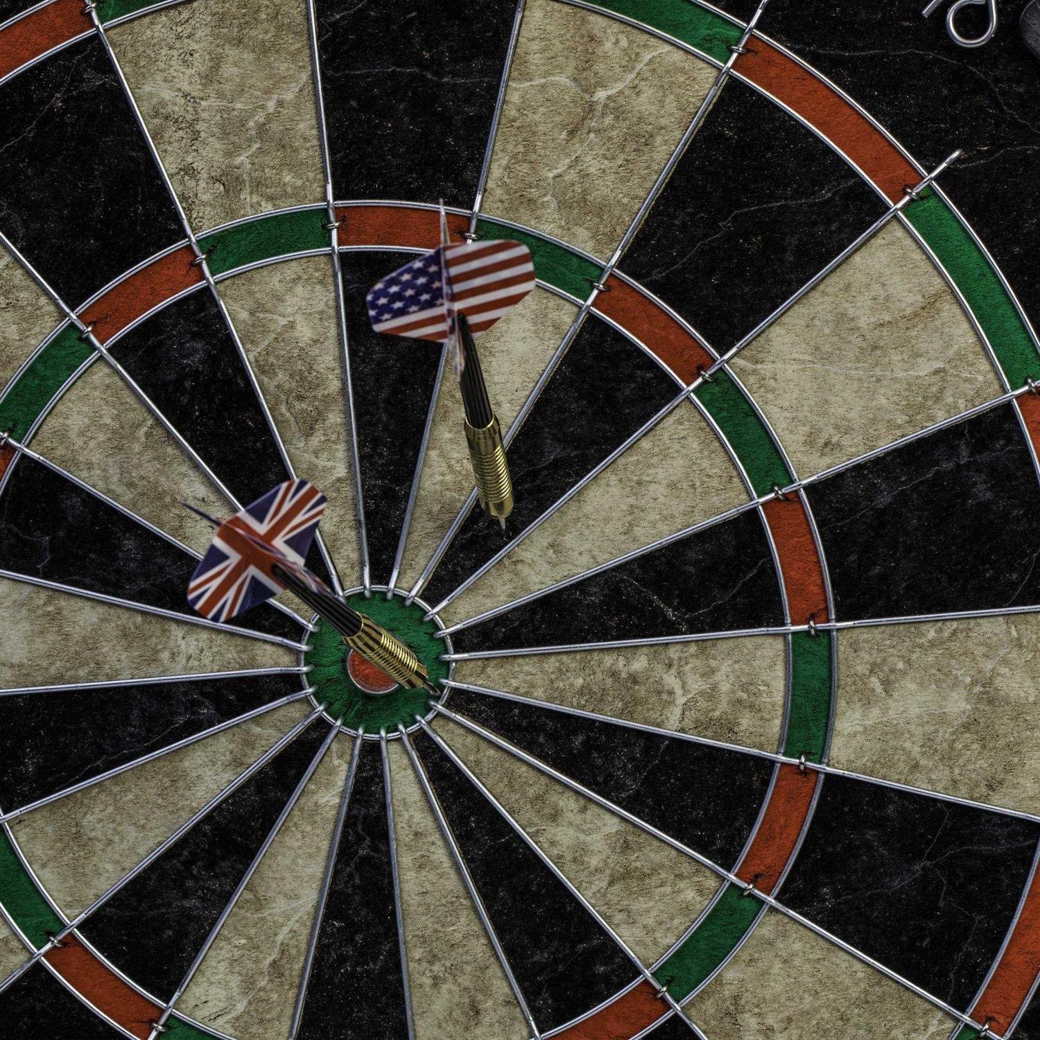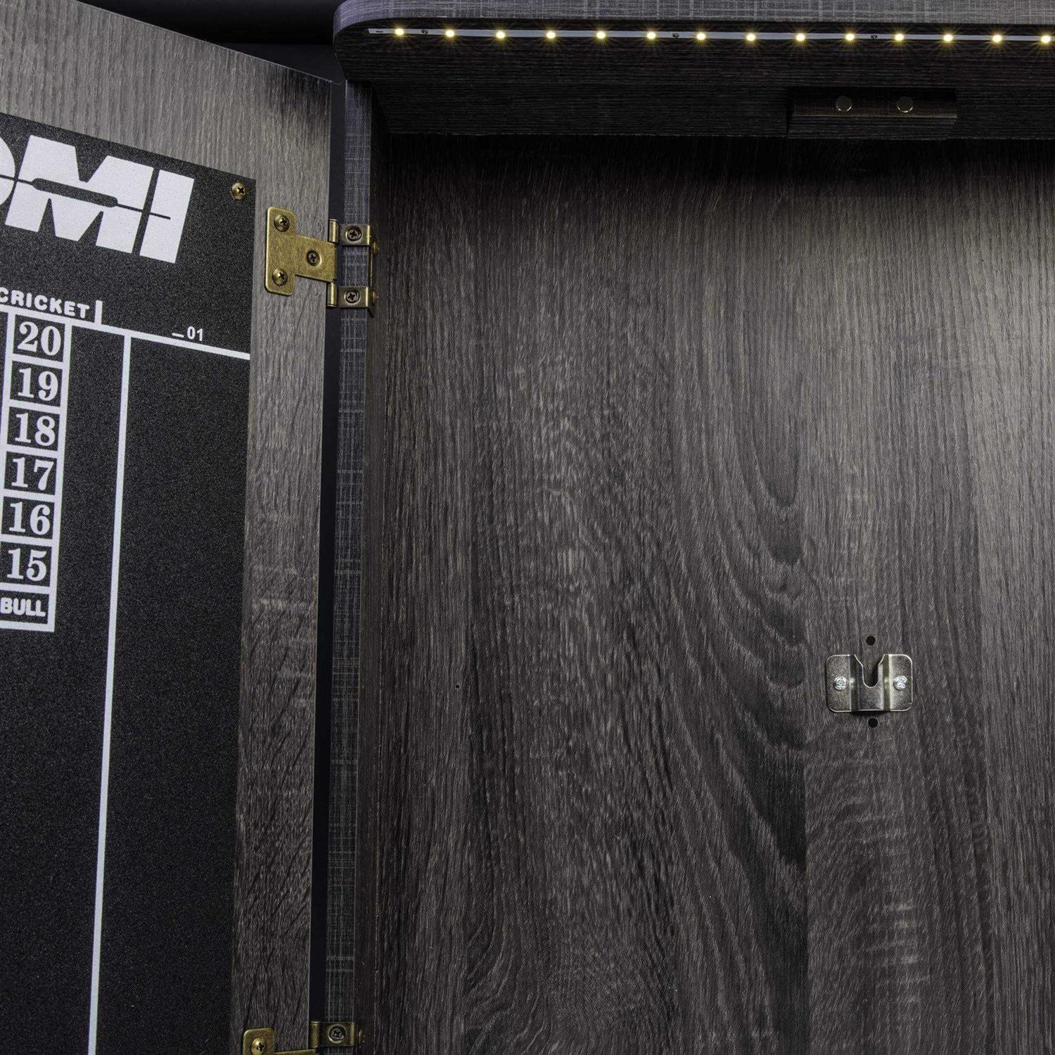 The Paris cabinet of lights features a unique built in LED lighting system that automatically turns on when you open the doors and shuts off when you close the cabinet doors. The top mounted LED light system is a nice finishing touch for game play in dim lighting that resembles authentic pub style play. The cabinet is finished off with a burnt grey wood laminate that will fit right in with todays homes dcor. The included dartboard is an official size 18in x 1.5in. Bristle sisal dartboard with self-healing properties. The board includes a rotatable number ring so that the heavy traffic areas of the board can be changed to prolong the life of your dartboard. The set includes 6 steel tip darts, so the board is ready to play on when you get it home.