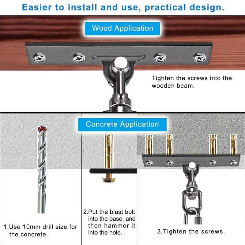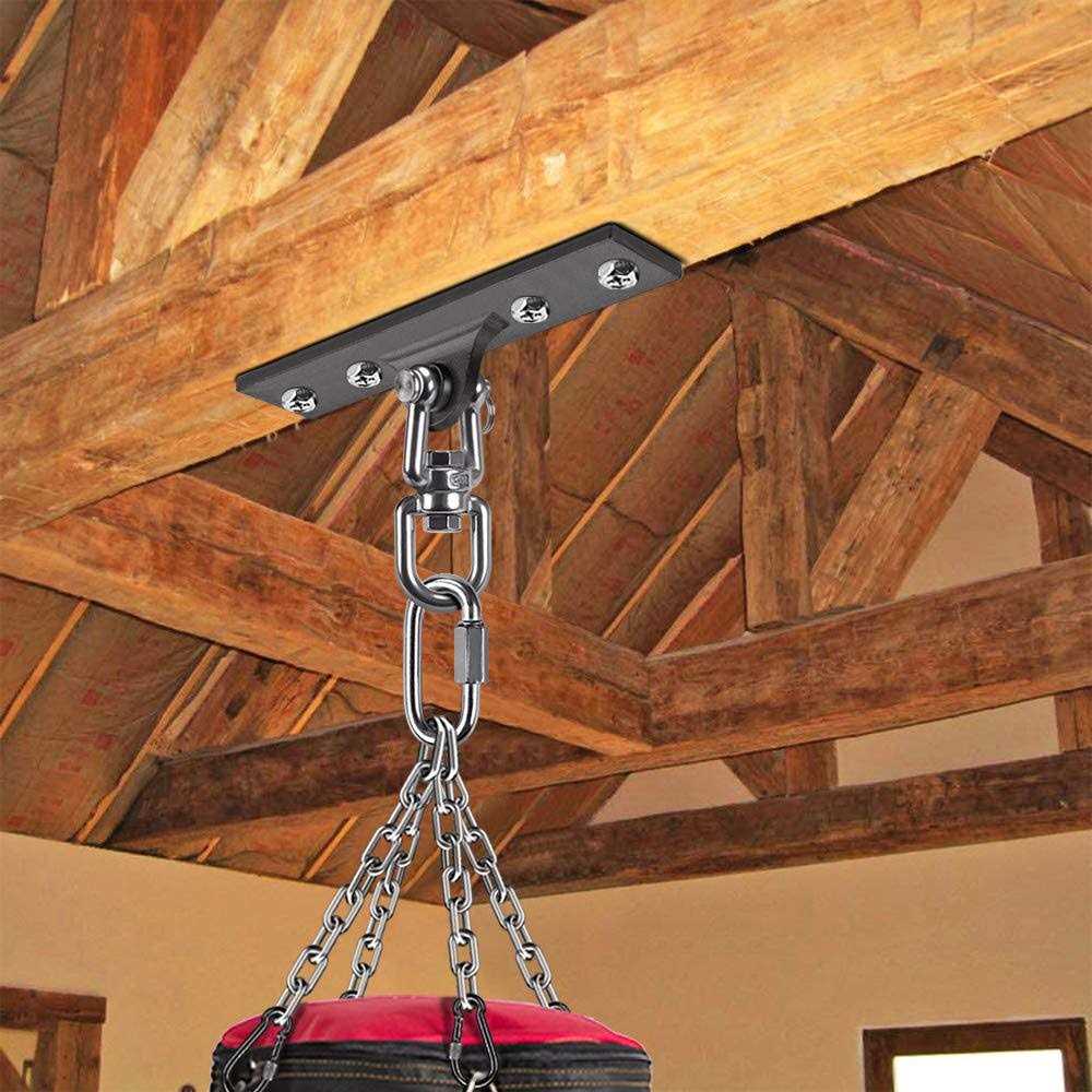 Dolibest Heavy Duty Boxing Bracket perfect for Boxing, MMA, Muay Thai or any of your favourite contact sports heavy bag training. Suitable for the home gym, commercial gym or health club. INSTALLATION STEPS Pre-drill two holes in the wooden beam, it is recommended to use a drill bit smaller than 0.5cm . Pass the screw through the hole in the base of the swing hanger, and use a wrench or electric drill to tighten the screw. Connect the carabiner to your sandbag. SIZE Including the carabiner and the whole assembly is 15cm long The diameter of the holes on the swing hanger base is 0.9cm PACKING LIST 1 Heavy Duty Wood Beam Holder With Swivel 4 Hexagon Wood Screws 4 Expansion Tubes 1Carabiners ATTENTION Its maximum weight is 270kgBe sure the surface to which you are mounting can support the weight and forces involved. In order to use safety,pls cheque thread rod and nut are weled LB.Beularly cheque if the fitting is deformed.