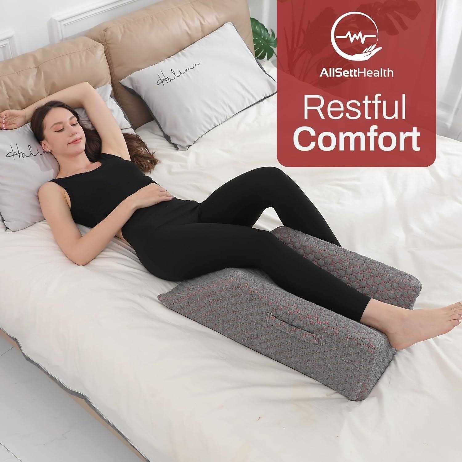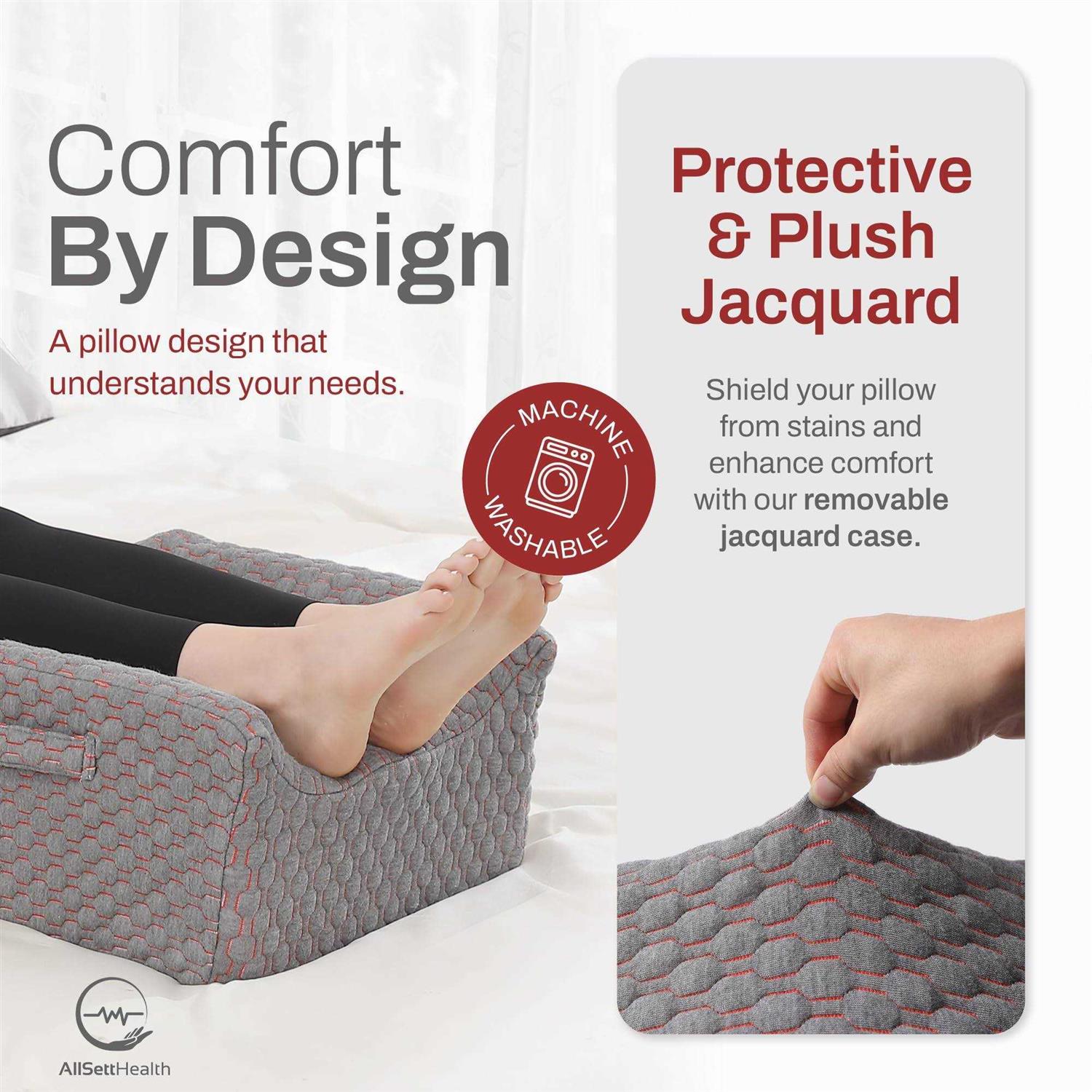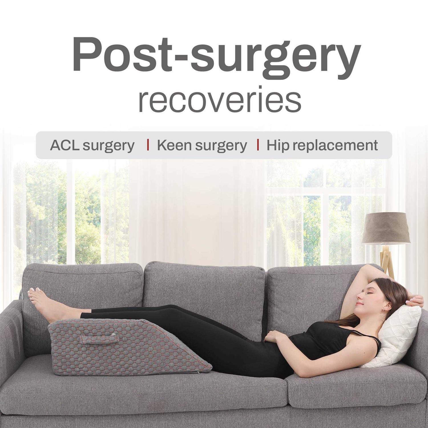 Enhanced Double Leg Elevation Wedge Support: Our leg elevation pillow is here to provide excellent support and a comfortable position for anyone recovering from leg surgery, knee surgery or want to enjoy deeper rest and sleep. Contoured U-Shaped Groove: These double leg elevation pillows for swelling feature a unique U-shaped groove that molds to the shape of your legs. This leg wedge ensures safe and comfortable positioning for enhanced protection while also preventing any discomfort during use. The perfect leg lifter for after knee surgery. Thick Memory Foam with Washable, Soft Cover : Crafted from excellent memory foam, these knee replacement recovery aids provide an excellent mix of support and comfort. The foam adapts to the shape of your leg, providing pressure relief and aiding in improving posture. The pillow features a removable, machine-washable cover that’s not only comfortable but also designed for protection, thanks to its plush jacquard case, adding an extra layer of padding to the product. Ergonomic Wedge Pillows for After Surgery: Our double leg elevation pillows for after surgery are thoughtfully designed with your well-being in mind. Measuring at 29 x 16 x 9.5 inches, this pillow offers ample space for your legs, ensuring comfortable and secure positioning. It provides a wide stable surface for both your feet, promotes blood flow and reduces swelling and discomfort. The foot pillow is an acl recovery must haves, as well as for people dealing with blood circulation conditions. Multi-Handle and Non-Slip Design: Two handles on the sides of the leg pillows for sleeping make it easier for you to position your body when lying down, these handles can also be used to carry the pillow making it portable and convenient. The bottom of the pillow cover is designed with non-slip silicone particles to prevent the leg pillow from moving during use.