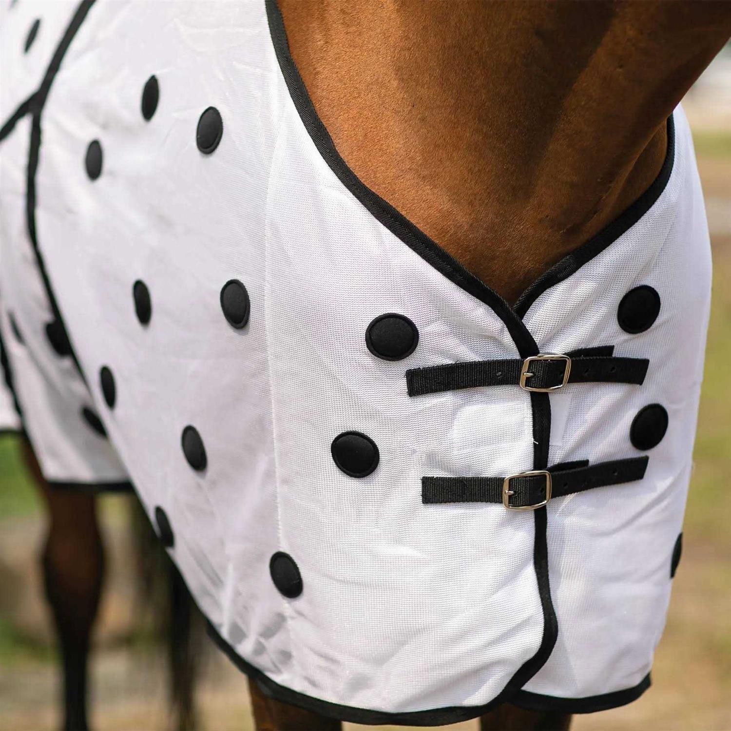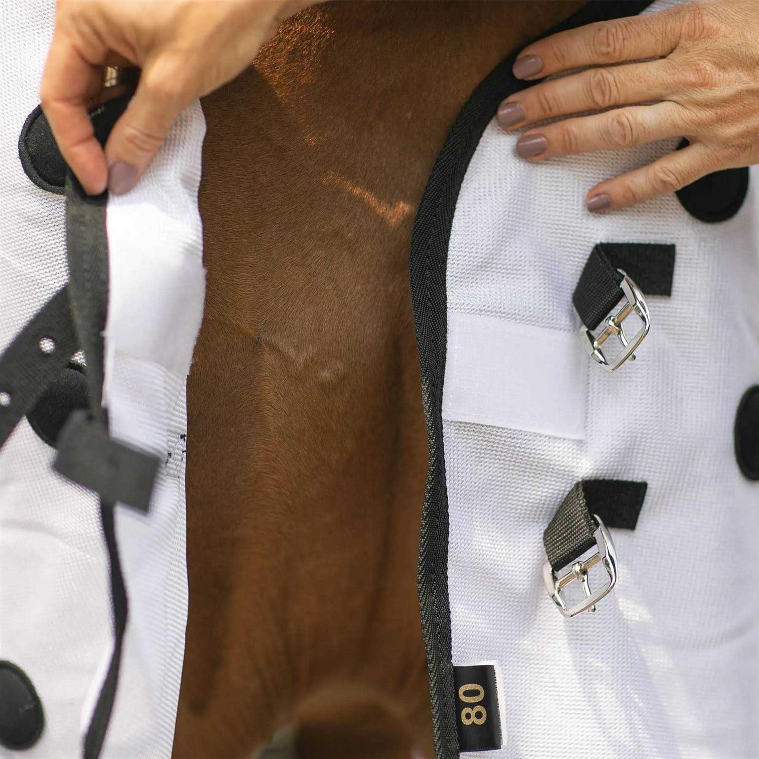 - EASY TO PUT ON – Features an open front with surcingle closure and hind leg straps which go on with a snap