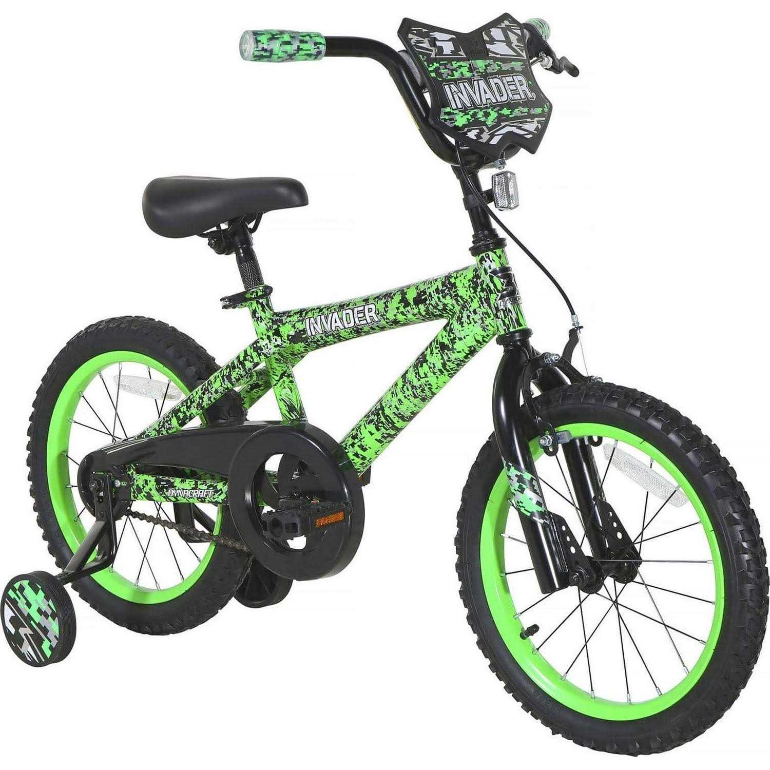 Get ready to storm into fun on the Dynacraft Invader 16 inch bike. With it’s unique green and black dipped deluxe paint finish Invader handlebar shield and Invader branded decals throughout everyone is sure to take notice when you ride in. With a rear coaster brake front hand break full cover chain guard and fully adjustable training wheels this bike is built for safety too. The Dynacraft Invader is a radical looking bike that is sure to steal the hearts of any young rider looking to ride into fun.