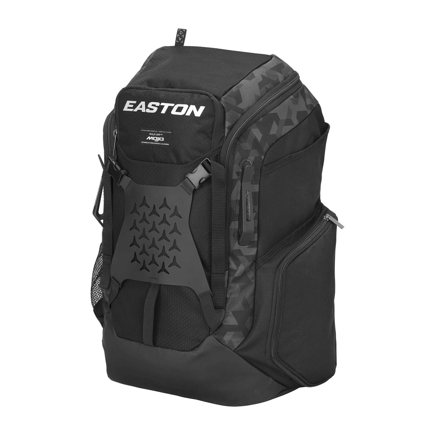 Equipment Bags by Easton. Details:The Walk-Off Mojo Backpack is once again setting the standard for baseball/softball backpacks. Packing a punch with dedicated storage options, the Walk-Off Mojo Backpack puts all your equipment at your fingertips. The updated helmet holder is flexible and fully adjustable to hold your helmet securely in place. The spacious main compartment opens up all the way around the front and top. Two full-length bat sleeves give quick access and protects bats in transit. Rounding out this premium bag is a convenient personal pocket, two mesh side pockets and a fence hook.