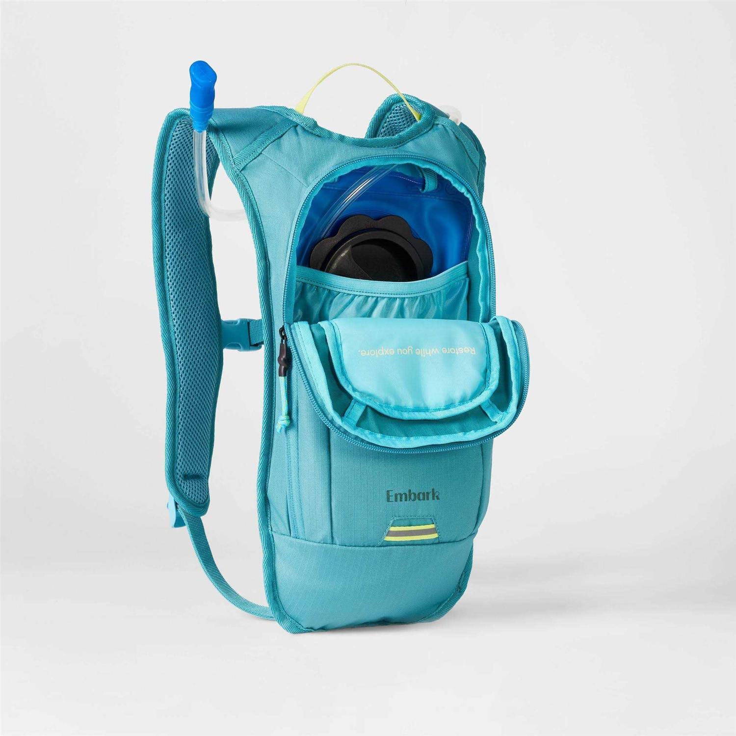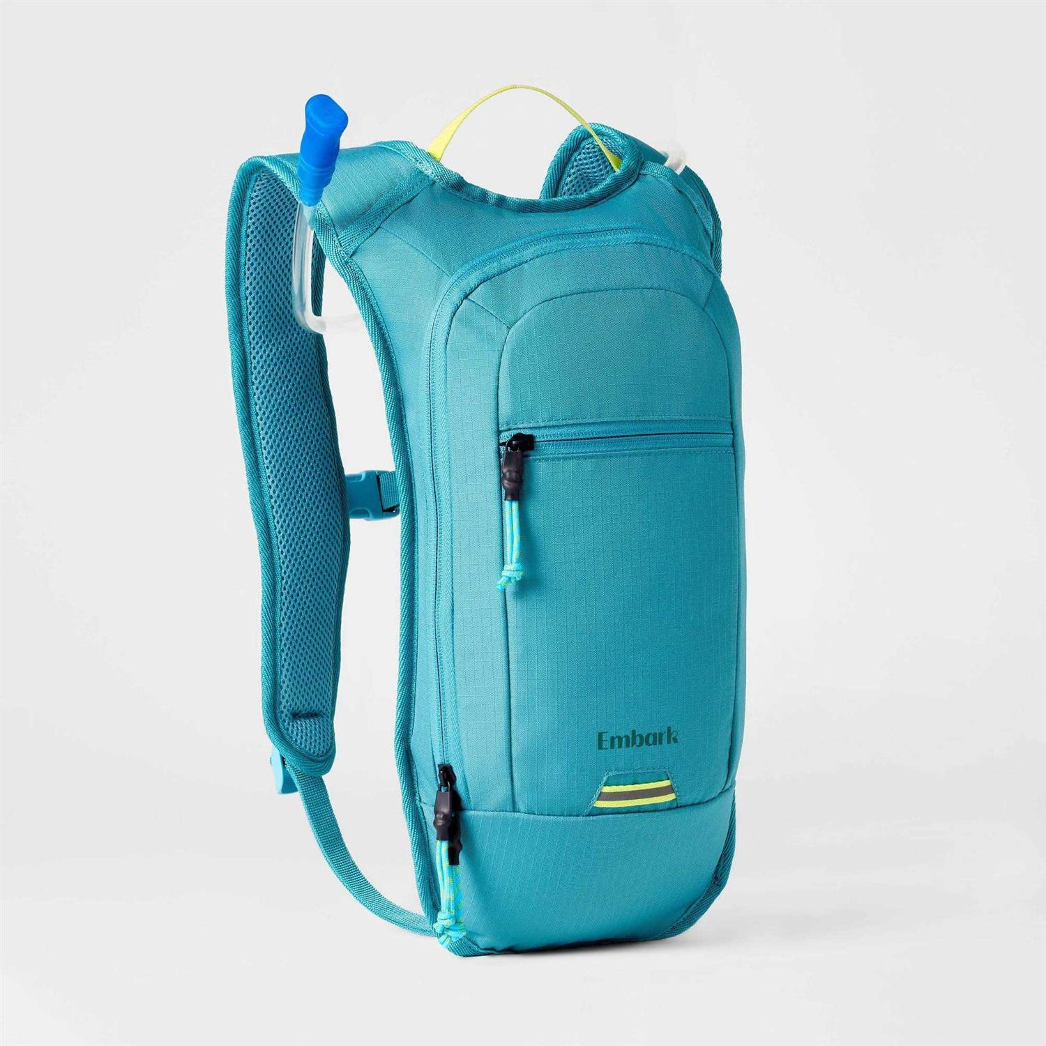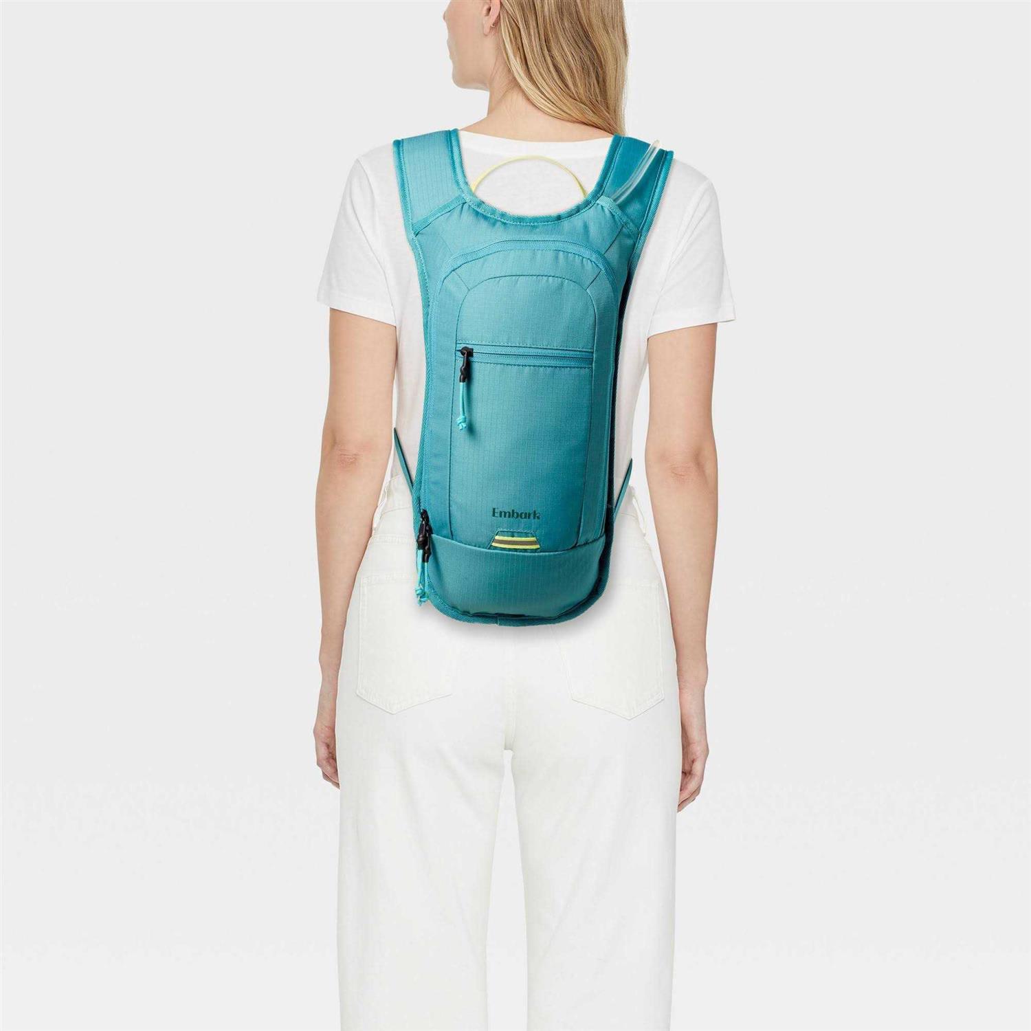 This 4-Liter Hydration Pack from Embark makes it easy to stay hydrated while camping, hiking, cycling and beyond. Featuring a water-resistant construction for lasting outdoor use, this small hydration backpack features a padded shoulder strap plus a sternum strap for easy, comfortable carrying. A two-liter hydration bladder sleeve with a tube straw allows for hands-free drinking, and the main zipper compartment plus an exterior zip pocket give you plenty of space for all your outdoor essentials. It also features a ventilating mesh back to help you stay cool plus reflective details that make you more visible in the dark or during inclement weather. Embark : Find wonder as you wander.