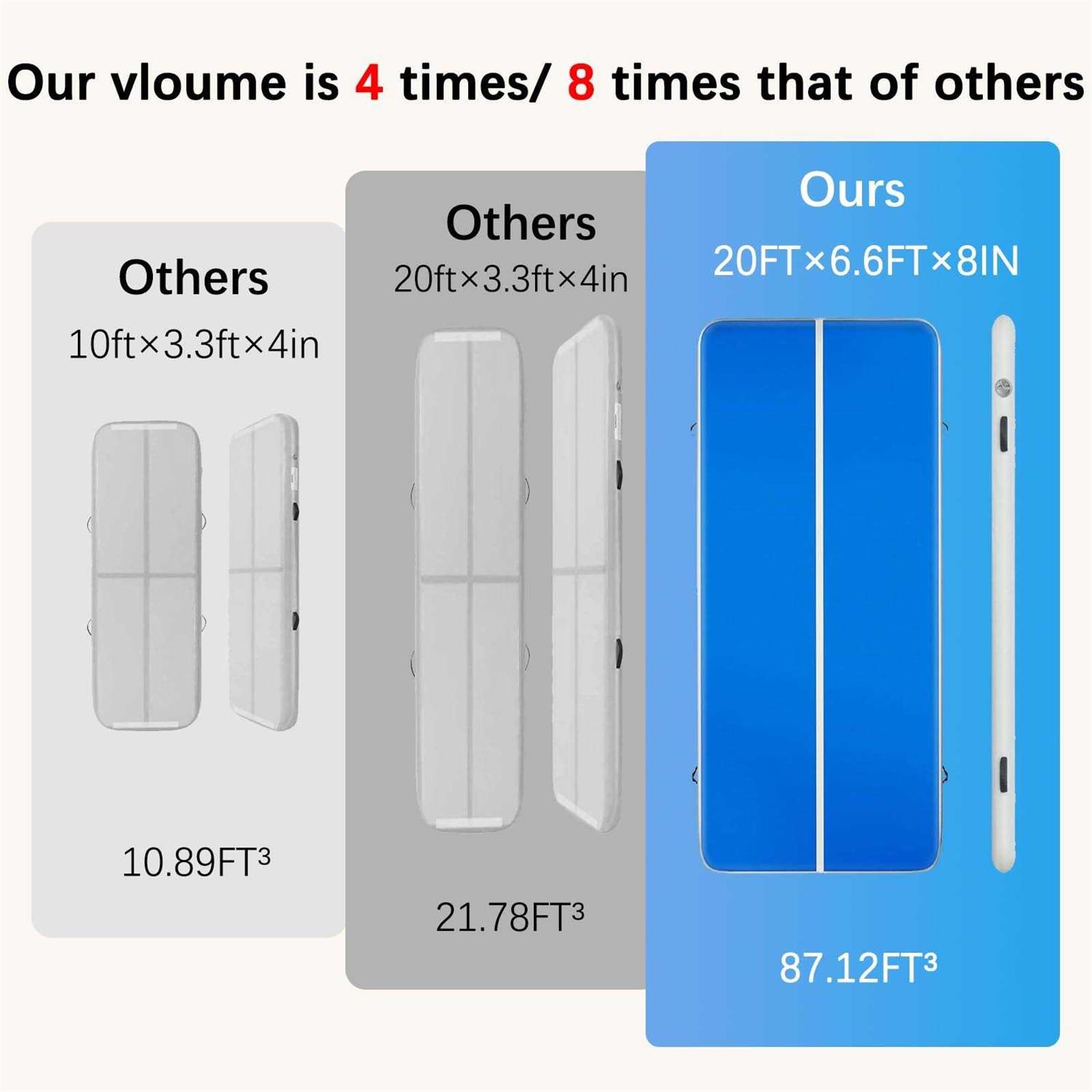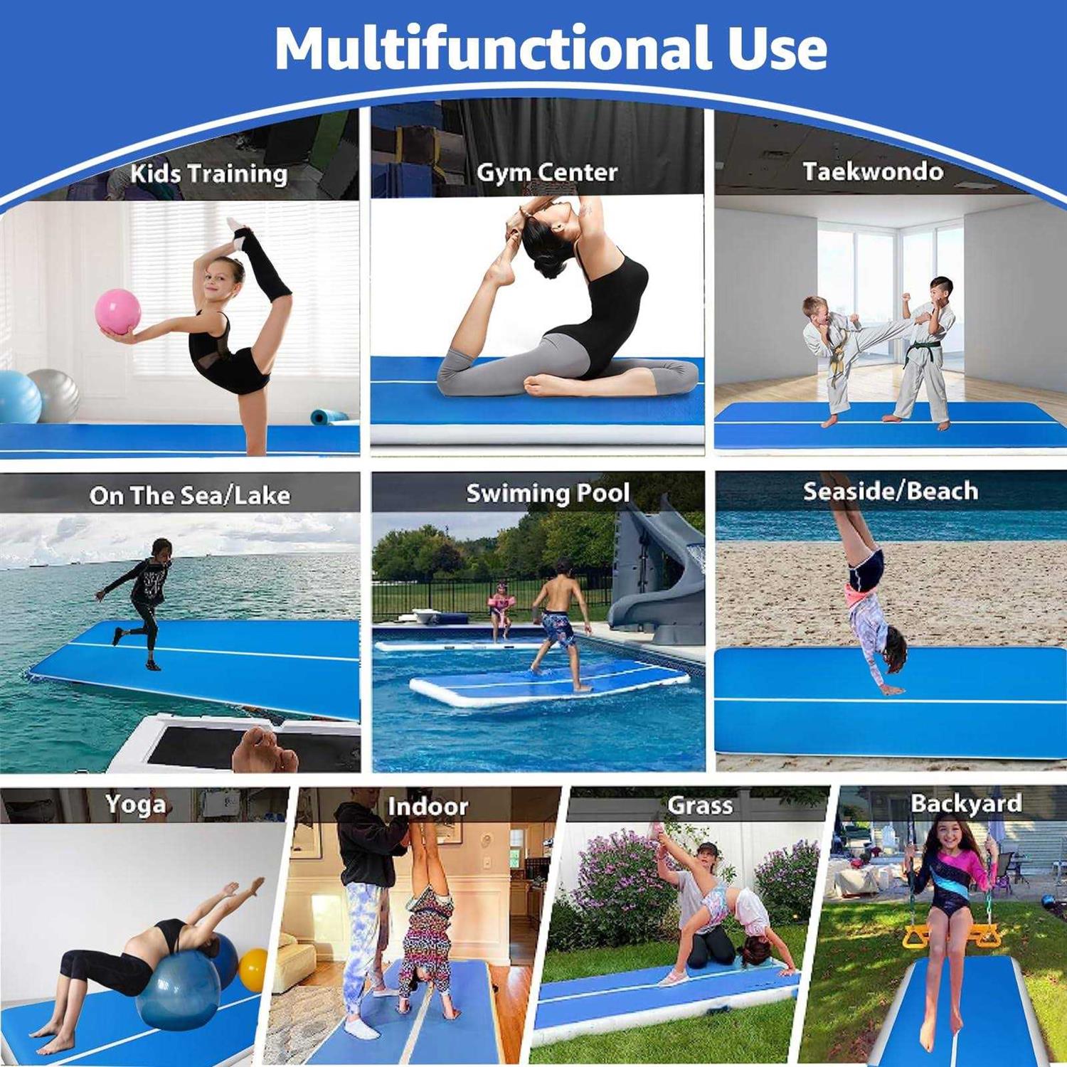 The Air Track Is 8 Inch Thickness Mat. The Mat Is 6ft Wide And Pairs Well With Similarly Thick 8 Inch Landing Mats, Creating A Level And Safe Transition Surface Off Or Around The Air Track Mat.the Air Track Is Therefore Not Only Suitable For Recreational Groups, But Also For Higher Level Gymnasts. Multiple Gymnastic Federations Already Use These Air Tracks, Instead Of Landing Mats Made Of Foam, For Trampoline Competitions. Great For Universities, Athletics Gyms, Acrobatics Schools And Other Athletic Facilities.it Can Be Used On Floor, Water And Grass . Just Make Sure There Is No Stone Or Sharp Things On The Grass To Hurt The Track.each Unit Runs From A High Output, Constant Flow Blower And Takes 5 Minutes To Inflate. Making It A Wonderful Piece Of Equipment To Have For Outside Demonstrations Or Performances.durable Drop Stitch Fabricelectric Pump Included For Quick And Easy Inflationheavy Duty, Military Quality Construction Pvcstiff And Stable In All Water Conditionsstainless Steel D-ring Attachments