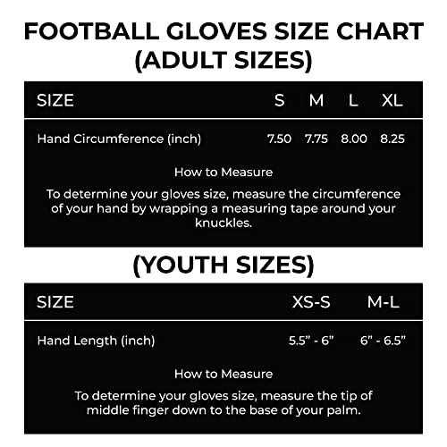Enhanced Sticky Gripessential Wear Football Gloves Are Designed With Special Focus On Grip While Playing And Preventing The Ball From Slipping Easily In Result Of A Collision Or Fast Run. Our Grippro Technology Make These Ultra-sticky Gloves The Best Football Gear Unlike Other Sports Gloves Which Tear Apart After Few Games. These Adult Football Gloves Are Specially Prepared To Perform Evenly Best Under All Climate Conditions In Order To Boost Your Confidence And Skills.breathable Ventilationlightweight Perforated Back Of Hand Provide Added Ventilation In All Weather Conditions And Prevent Unnecessary Slippage Inside These Skin Tight Gloves And Make You Feel Like You Are Not Wearing The Gloves At All. By Analyzing The Defects In Other Models Of The Competition This Unique Football Glove Design Has Been Crafted To Offer You Optimal Game Changing Performance On The Field.supreme Quality & Perfect Fitwe Believe In Continuous Improvement In Quality And Design Therefore Extreme Comfort & Durability Is Experienced Due To Well-crafted Design & Unique Compression Material. Advanced Stitching At All Stress Points With Neoprene Cuff Compression And Large Gusset To Provide A Custom Fit Football Receiver Gloves.perfect Adult Sizeswide Range Of Sizes Are Given In Size Chart From Small To Large For Adult Athletes. Sizes Ranging From Small To Extra Large Gloves Are Available Irrespective Of The Age For A Perfect Fit. Velcro Closure Strap Provides Wrist Protection And A Snug Fit To Allow Freedom Of Motion. It Is Recommended To Use A Damp Cloth To Wipe Down The Dirt On The Gloves Palm In Order To Keep The Silicone Palm Super Sticky And Ready For Next Game.