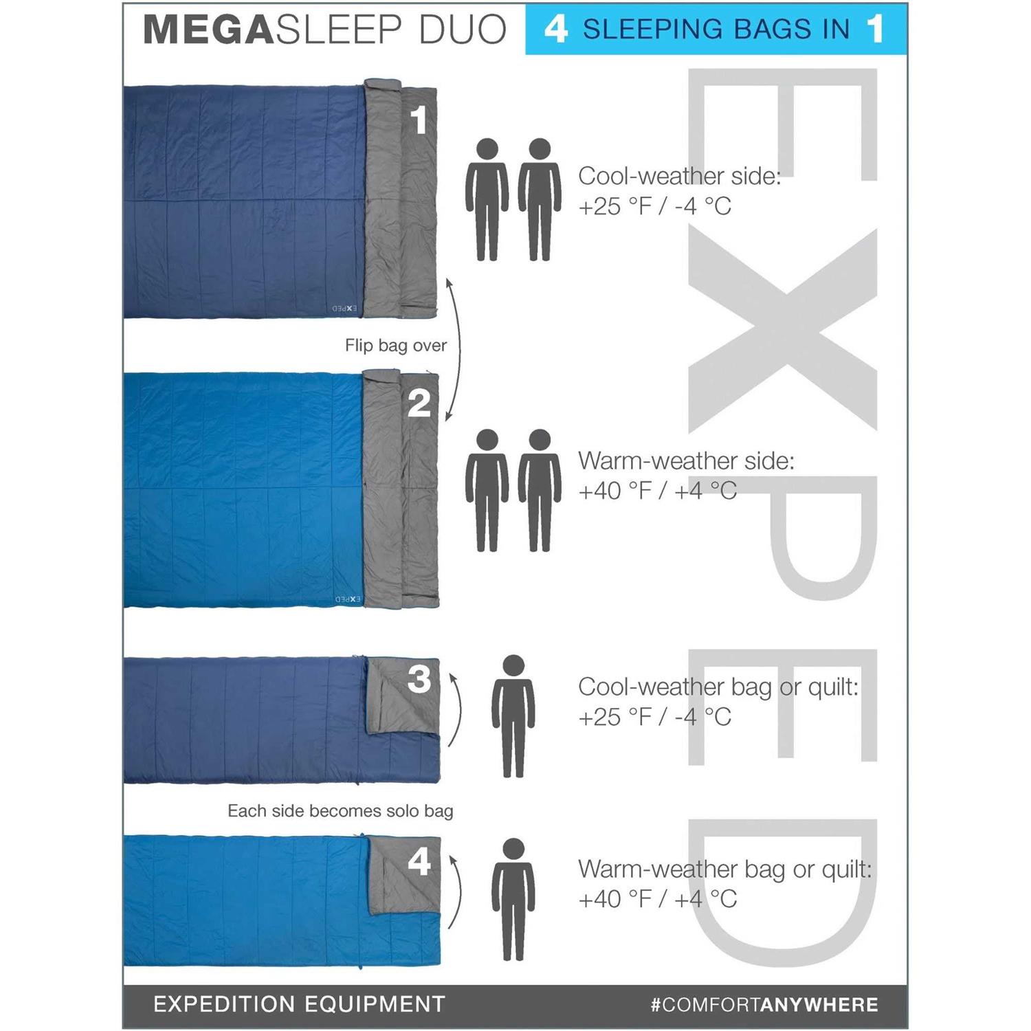 The versatile Exped MegaSleep Duo 25 sleeping bag is a one-of-a-kind double-wide sleep solution that has the versatile ability to be separated into a 25 degree bag and a 40 degree bag. By flipping the bag over, it can be used as a two-person bag in cool (down to 25 degrees) or warm (down to 40 degrees) weather. Alternatively, the top and bottom of the sleeping bag can be separated, so that you have two solo bags. The bag is insulated with synthetic polyester microfiber fill that insulates well even in wet or humid conditions. A 40D ripstop nylon exterior shell further protects the insulation from the elements. A full-length draft tube minimizes cold drafts. The bag has a roomy interior to offer plenty of space for up to two sleepers. Both sides of the bag can be removed and used as plush blankets to allow maximum freedom of movement. When unzipped, one side can be used as a stand-alone 40 degree bag and the other a stand-alone 25 degree bag! Available in Medium (fits to 5′ 11′) and Large (fits to 6′ 5′) size options, the Exped MegaSleep Due 25 Degree sleeping bag includes a convenient storage duffel bag.