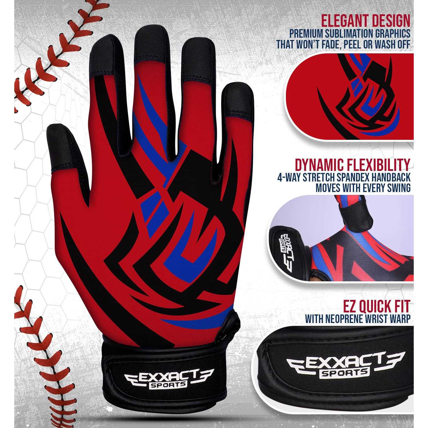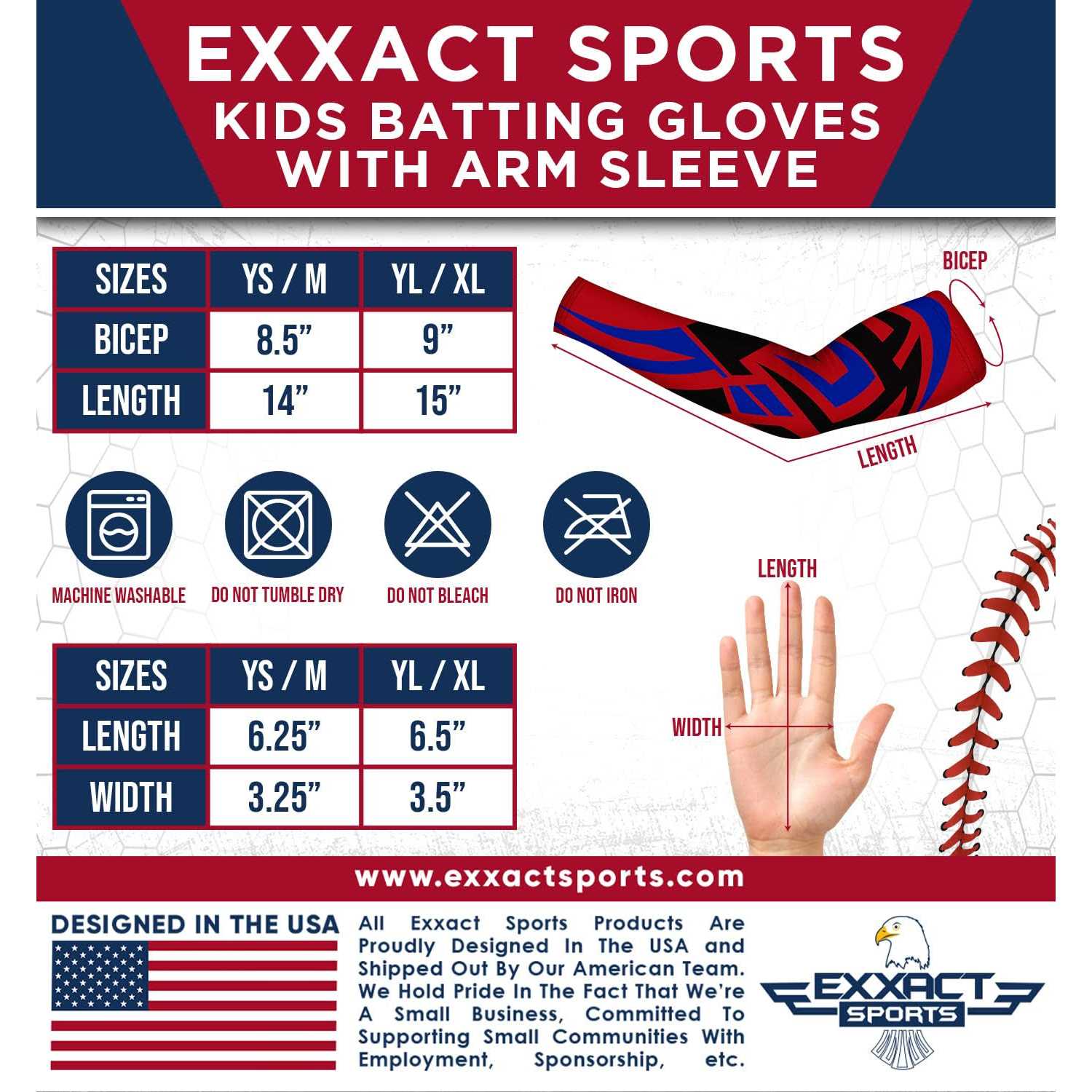 Engineered Leather, Spandex, Imported Built to Perform: Our youth baseball batting gloves are made with incredibly soft and breathable high-quality materials, with a synthetic leather soft palm and breathable materials on the back to ensure a perfect fit every time. Designed to fit like a second skin, our gloves provide unbeatable comfort for youth boys, and women softball players alike. Stand Out on the Field: Bold Sublimated Graphics with Arm Sleeve which is made from 210 GSM Spandex, offering a snug fit that contours to your arm and improves circulation providing style and function. Enhanced grip and long-lasting durability ensure superior control and comfort. Choose from Digital Camo, Tie Dye, or USA Flag designs that won’t fade or wash off, and show off your unique style while dominating the game. Control the Game: Grip is everything when it comes to batting, and our mens batting gloves deliver on this front, with synthetic leather palm ensures maximum control, giving you the power and precision to hit the ball out of the park. The Neoprene Wrist Strap ensures to put them on and take them off quickly. No more struggling with complicated straps or wasting time getting ready to play – you’ll be ready to hit the field in no time. Elevate Your Game: Our baseball and softball batting gloves are more than just a piece of equipment – they’re a game-changer. With supreme comfort, superior grip, unique designs, and unbeatable durability, our gloves are the ultimate tool for taking your game to the next level. Choose our gloves and dominate the field like a pro. p strong Get ready to dominate the field with Exxact Sports Youth Baseball Batting Gloves and Arm Sleeve Combo. /strong – These aren’t just any ordinary gloves – they’re a complete game-changer that will take your performance to new heights. Made with high-quality Lycra/Spandex, they deliver unbeatable comfort and control, allowing you to stay focused and confident at the plate. – Featuring bold sublimated graphics, durable materials, and a comfortable fit, this set has everything you need for peak performance. The gloves offer enhanced grip and long-lasting durability, while the arm sleeve is made from 210 GSM Spandex, contouring to your arm for improved circulation. Choose from Digital Camo, Tie Dye, or USA Flag designs that won’t fade or wash off, and express your style while crushing the competition. – But these gloves aren’t just about function – they’re also fashion-forward. With vibrant and unique designs, you’ll stand out on the field and showcase your personality. Whether you’re playing baseball or softball, these gloves have got you covered. – Don’t just take our word for it – players worldwide have given our gloves rave reviews. With a focus on quality, comfort, and performance, these gloves are the ultimate choice for anyone looking to take their game to the next level. – strong Choose Exxact Sports Sublimated Gloves with Arm Sleeve and dominate the game like a pro. /strong /p