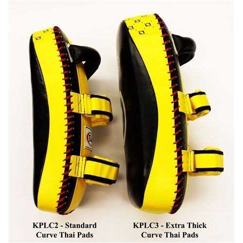 KPLC2 Yellow/Black. remium Cow Hide Leather. #KPLC Curved Kick Pads / Standard. Curved design made from premium cow hide leather. Ergonomically fit to forearm of trainer due to the curve. Soft pads on the head designed for trainer to jab and hook.