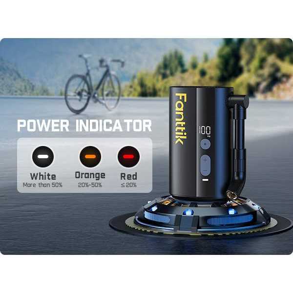 Fanttik X9 Ace Mini Bike Pump is designed specifically for cyclists with its compact dimensions of 3.87 x 3.14 x 1.56 inches and palm-sized design, weighing only 0.97 lbs. Easily portable, it fits into a pocket or backpack, ensuring you’re prepared for any ride. The X9 Ace electric cycle pump solves the problem of tire leakage or insufficient air pressure during rides, making your journey smoother. Powered by a 5000mAh battery, this electric bicycle air pump can inflate 8 tires on a single charge and features a cooling system, allowing for continuous operation for 25 minutes without breaks. This electric bike tire inflator combines the hose, body, presta, and schrader valve into one unit, simplifying storage and enhancing portability. With its 360° rotation hose, it allows for hassle-free installation of bicycle valves without awkward angles or dead ends. Despite its palm-size proportions, the X9 Ace electric bicycle tire pump delivers ultra-fast performance, with a maximum pressure value of 150PSI and 10L/min wind speed, refilling a 700 x 23C tire (80-100 PSI) in just 32 seconds. It can top off a road bike tire (0-100 PSI) in 1 minute and 32 seconds. Once you’ve set your desired pressure, this bike tyre pump automatically halts when the target pressure is reached, indicated by 3 different colored indicator lights. With its maximum pressure value of 150PSI, it can inflate Road Bike, Mountain Bike, E-Bike, and City Bike tires with ease. Say goodbye to tire pressure worries with the Fanttik X9 Ace Cordless Bike Pump!