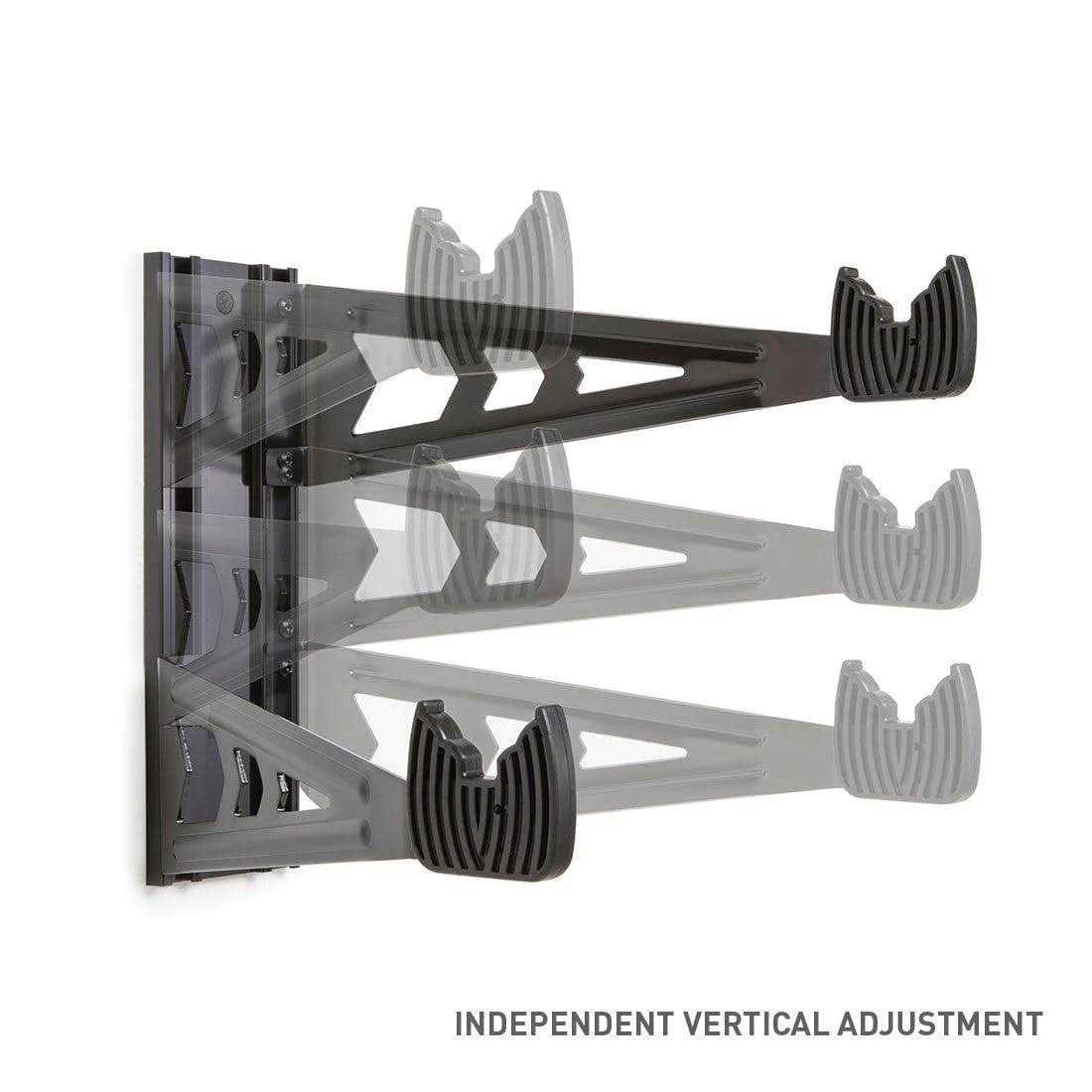 The Velo Wall Rack is a high quality, versatile bike storage idea for one bike. The arms independently adjust vertically, and have soft rubber protecting your bike’s finish, making the Velo Wall Rack a brilliant, minimalist bike storage solution for expensive road, cyclocross, mountain and electric bikes. Storage system fits most any road bike, cyclocross bike, mountain bike, or electric bike. Soft rubber Frame cradles safely accommodate most any frame tube shape. Innovative design independently adjusts arms vertically to position your bike perfectly. Provides an awesome bike parking solution for even the heaviest of bikes – 70lbs (31.8kg) max load. Cradles independently adjust vertically 7″ (17.8cm). Cradles positioned 12″ (30.5cm) from wall. Mounts to standard wall stud with included hardware.