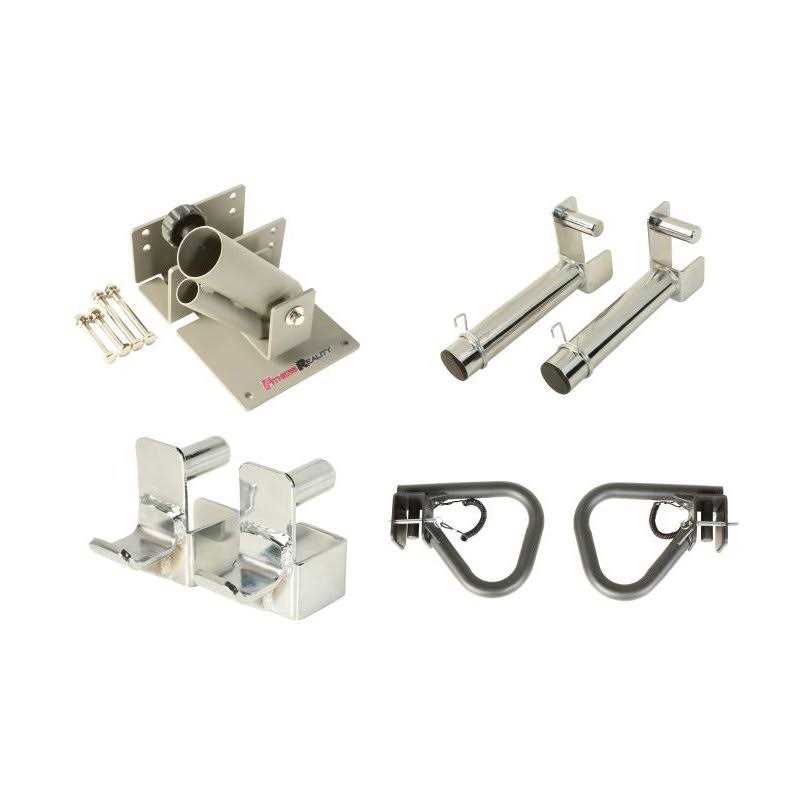 Fitness Reality. Real people. Real results! The attachment set will be a great add-On to your gym. So train hard and get the results you want with the Fitness Reality attachment set, including landmine, Olympic plate holders, 2 j-Hooks, and 2 dip bars.