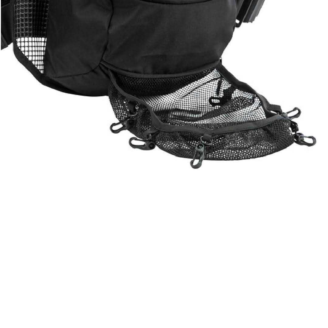 - Chest Harness system with Velcro elastic bands for flexibility Stowable outer mesh carry-all flap Front pocket for smaller accessories