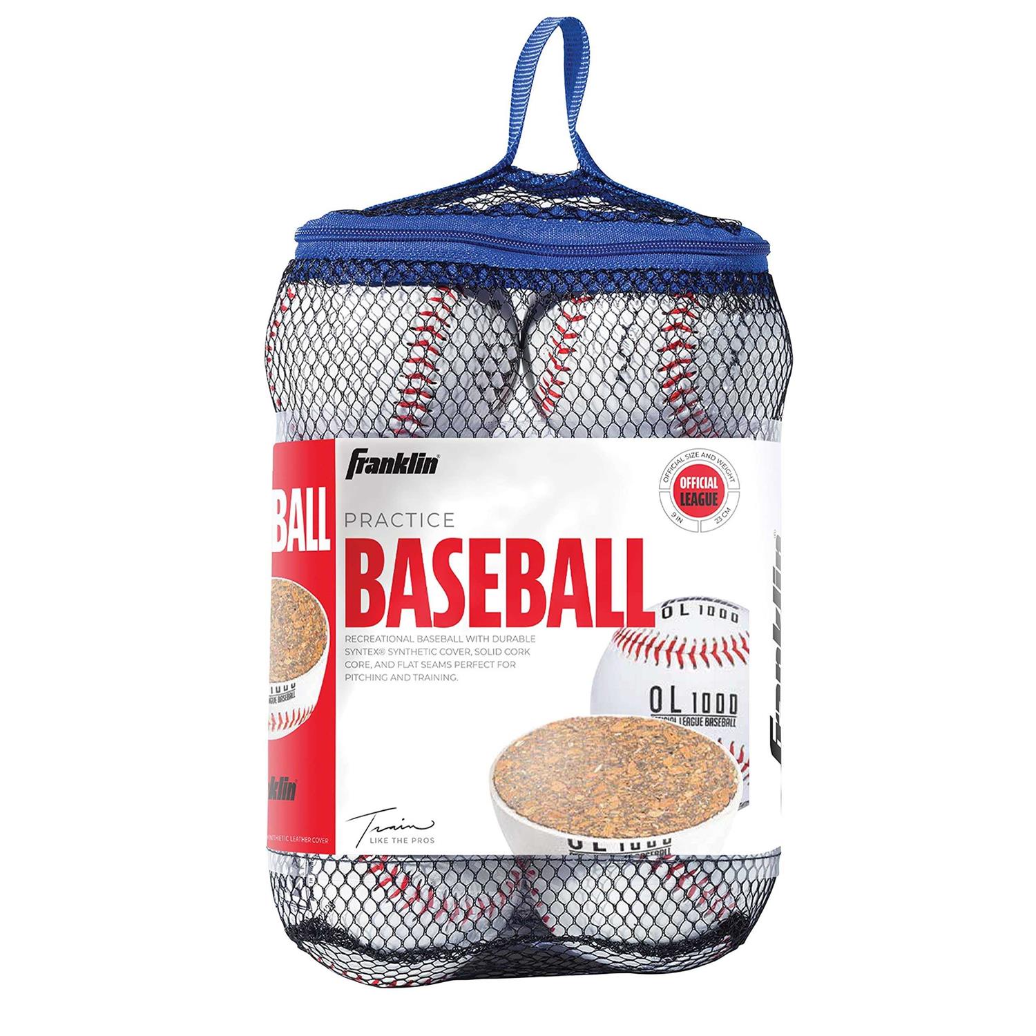 Get training done right with Franklin Sports Practice Baseballs. They feature a synthetic cover, cork/rubber core and flat seams for comfort and ease of use. Franklin Sports baseballs are official size and weight for league play, so your training will pay off, whether you’re young and learning how to play or are a pro looking to stay at the top. They’re excellent for pitching, catching and batting practice alike, letting you train in all aspects of the game. The set contains six Franklin Sports Practice Baseballs.