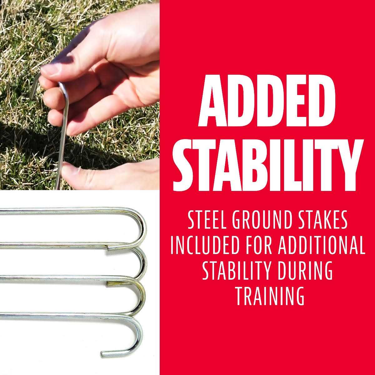 Some assembly required. Nylon carry bag for easy storage and transportation. Fiberglass support poles and ground stakes included. All sport backstop and target perfect for baseball softball lacrosse and more. 7’h x 10’w frame.