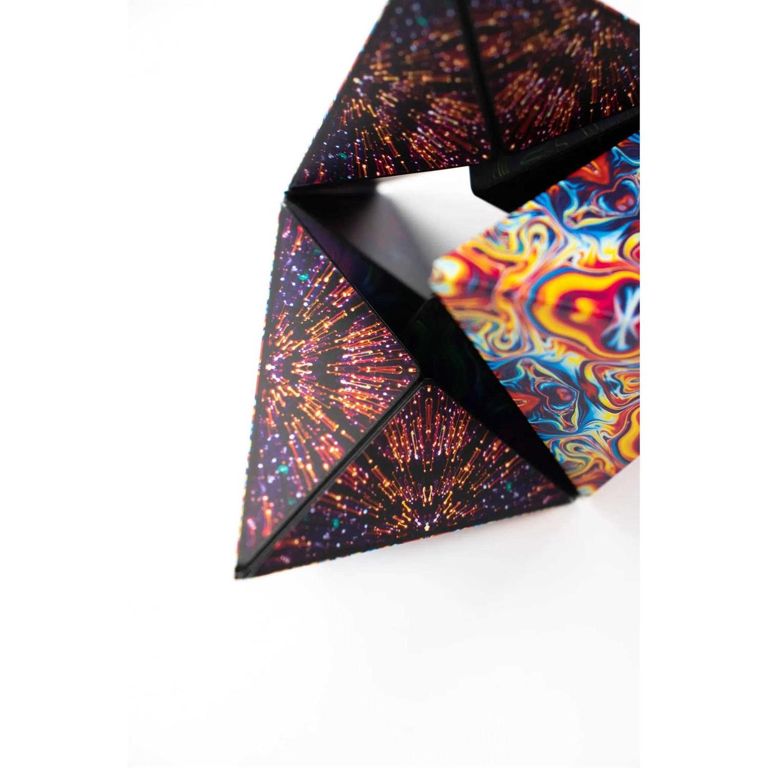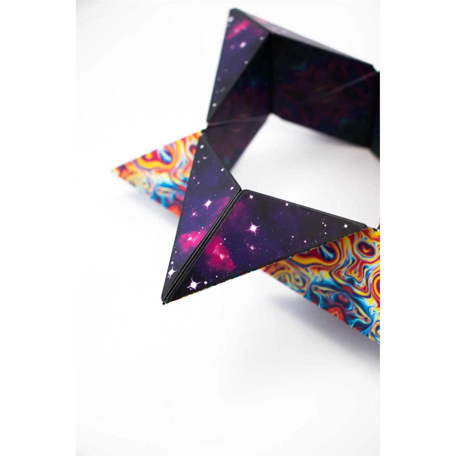 Shashibo – the successor to GeoBender A complex magnetic 3D puzzle that transforms into over 70 shapes. Each cube consists of 12 magnetic pyramids, each pyramid contains three magnets. The individual pyramids are connected by hinges to form a chain or ring. By means of the hinges, the Shashibo Cube can be transformed into different shapes. The magnets create solid coherent shapes. In addition, several Shashibo Cubes can be connected to each other with the help of magnetism and thus build geometric shapes of high complexity. The GeoBender Cubes are compatible with the Shashibo Cubes.