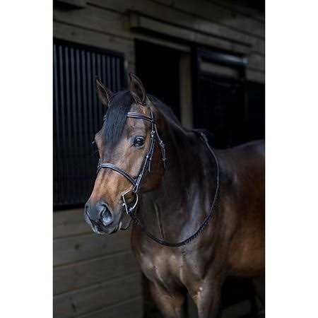 Beautifully crafted from supple, pre-conditioned leather. This bridle is a fancy stitched raised leather bridle and has white stitching on it, it comes with plain laced reins which have hook studs for the attachment of a bit. Measures: Bit to bit: 28.5″ to 36″, Nose: 18.5″ to 22.5″, Brow band: 13″.