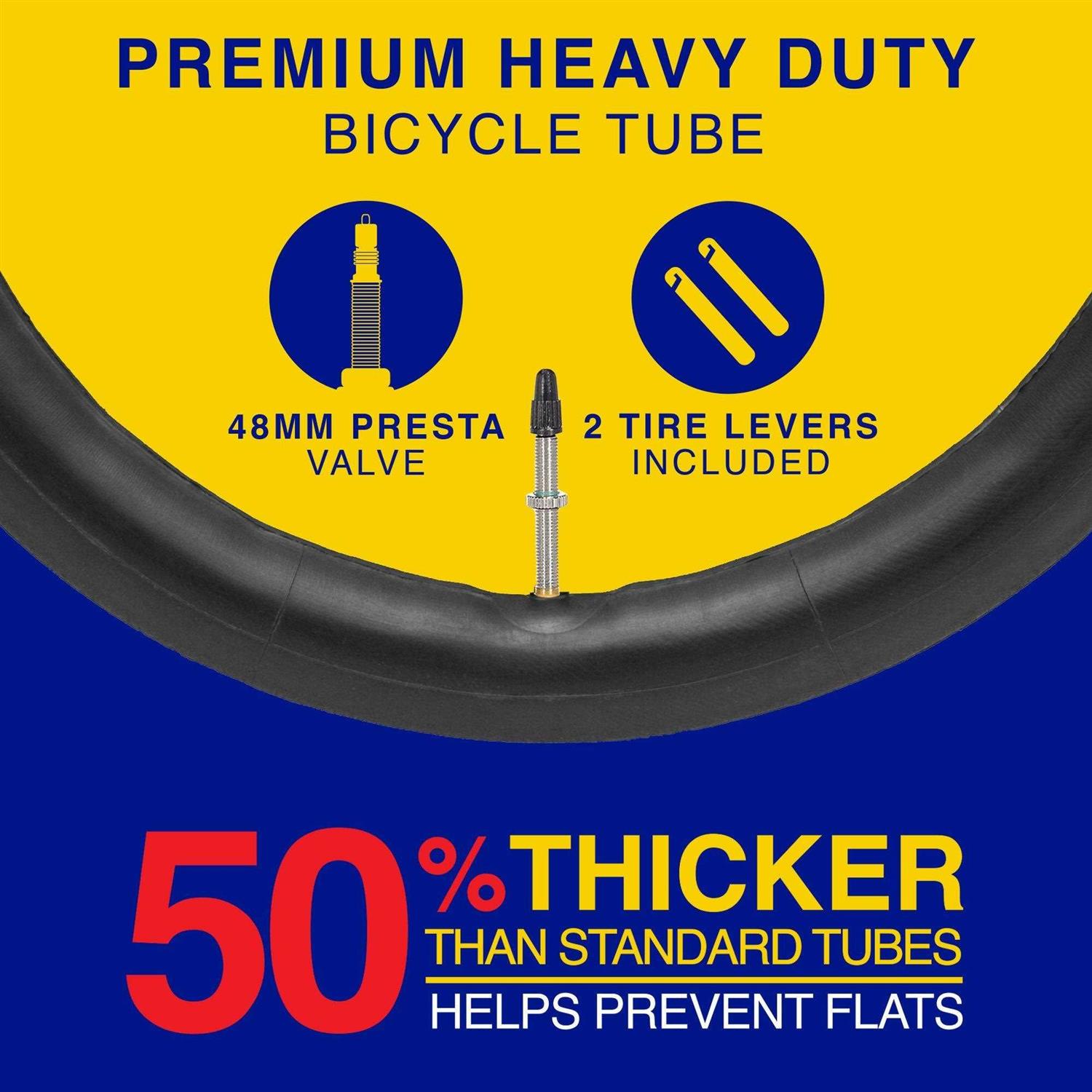 Butyl rubber provides a smooth ride for every age rider and all types of bicycles. This bicycle tube is designed to fit all 27.5-inch bicycles with tire widths ranging from 2.1 inches to 2.4 inches. It features a Presta or French valve that fits any hand pump or floor pump.