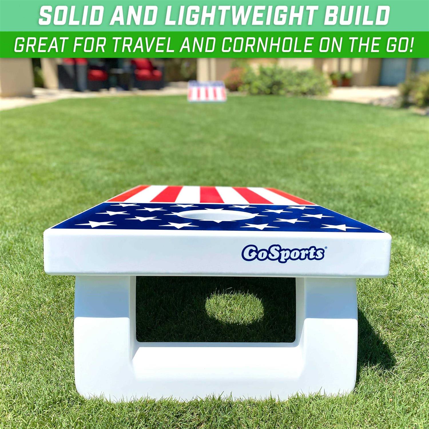 Cornhole Sets by GoSports. Details:The GoSports All-Weather Cornhole game set was designed to provide for a superior cornhole experience by maximizing durability, portability, and game quality. The 4 ft x 2 ft boards are full regulation size for authentic gameplay, but they are made from durable yet lightweight hard plastic to make them portable. Premium materials help make this set a leader in the cornhole market in terms of durability and price. The set also includes 8 all-weather duck cloth bags, not the cheap sand filled bags other companies use that feel like bricks. Our boards are also unique in that the base leg folds in for easy portability/storage, but this does not affect gameplay in any way. All the bags can be stored inside the folded boards when not in use. Choose from our fun patriotic American Flag design, or classic Red and Blue designs.
