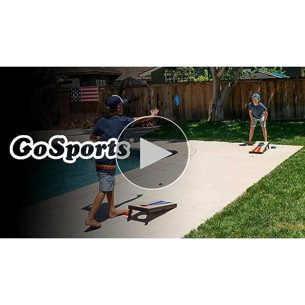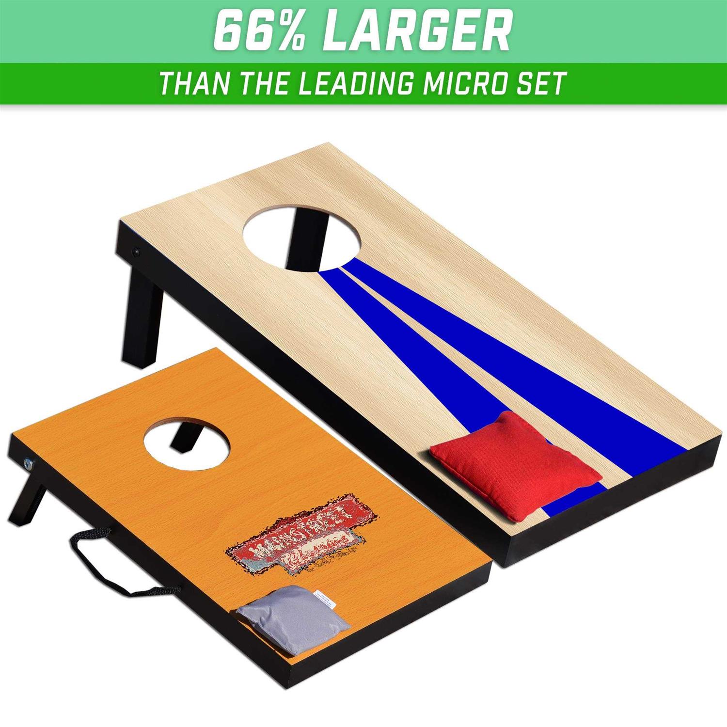 GoSports Gosports portable size bean bag toss game is perfect for indoors, outdoors, and in smaller spaces. The compact size provides all the fun of full-size sets, but just proportionally scaled down. This however is not a micro-set or tabletop set, so you still get all the fun of cornhole. The game is made from durable, yet lightweight mdf wood with a slick vinyl surface. Each set includes 6 premium duck cloth bean bags (3 red + 3 blue) for 2 or 4-person games. The boards conveniently hook and loop together to hold all of the bags and include carrying handles. The object of the game is to toss the bean bags onto the board for 1 point or into the hole for 3 points (full rules and instructions are included). Great way to get countless hours of active fun.